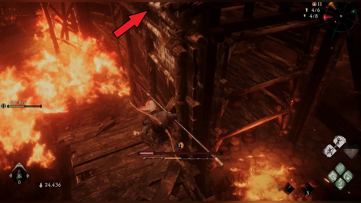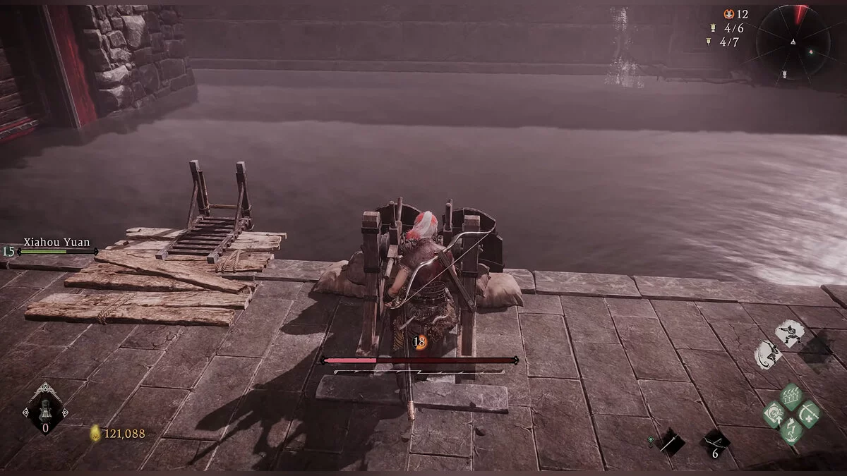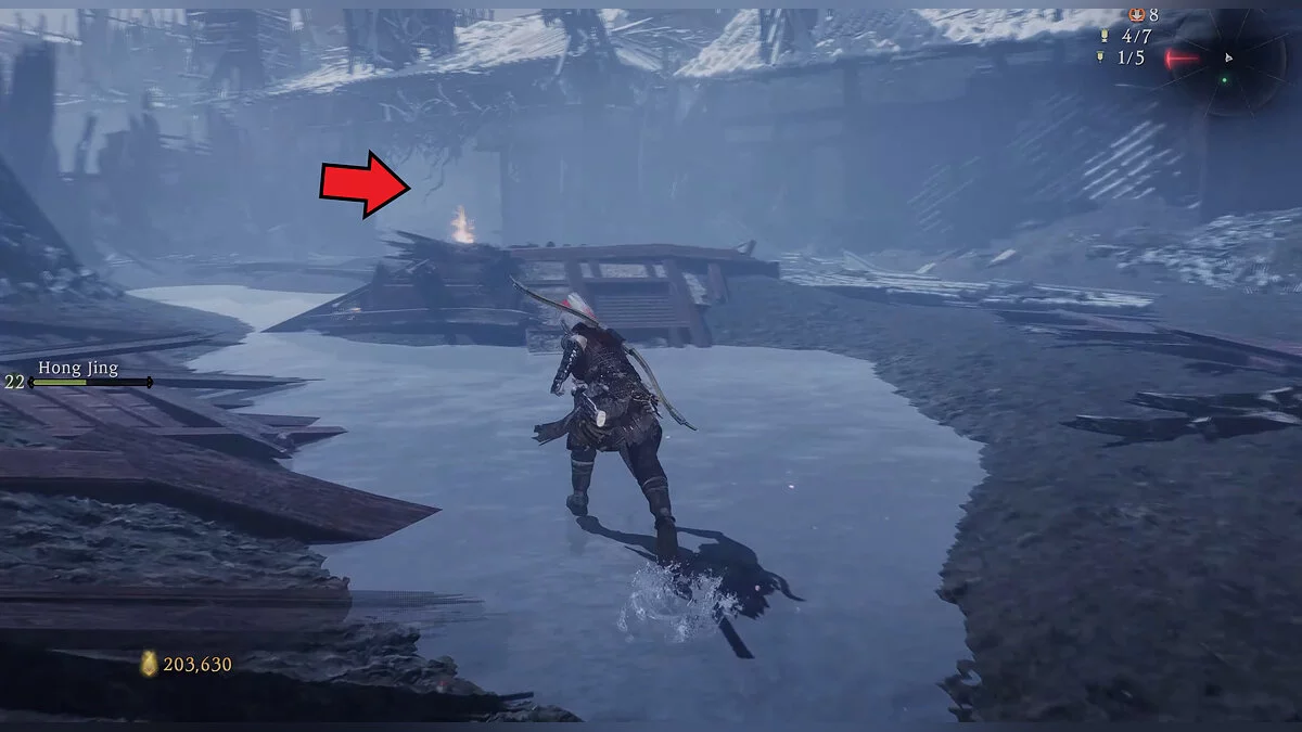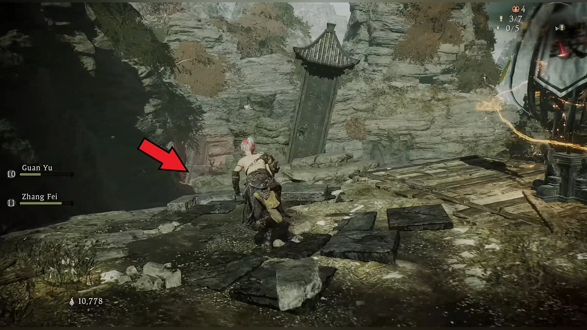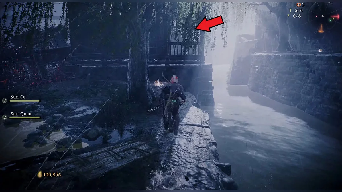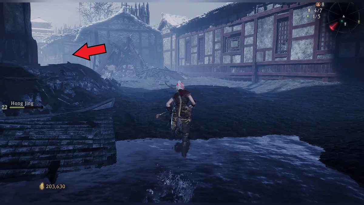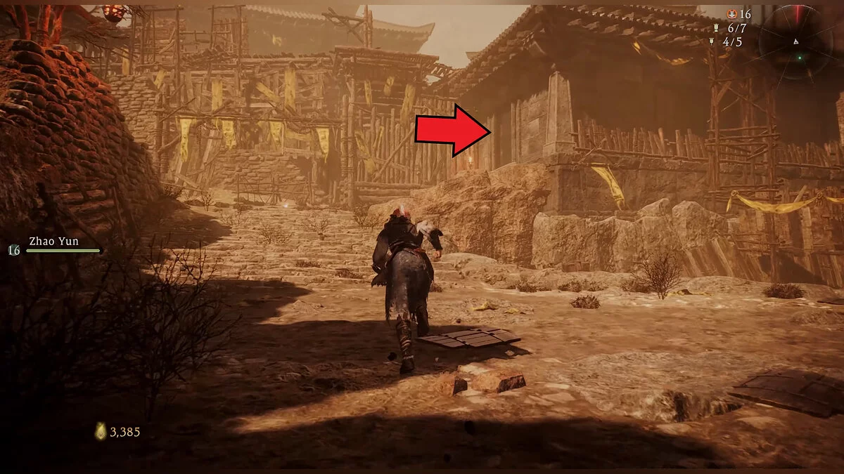 Миссия: «Люй Бу — самый могущественный среди людей». Начинайте поиски от пятого боевого флага. В затопленном городе идите через руины к разрушенному зданию. От здания идите направо и перепрыгните через обломки в переулке. Здесь незатопленная тропинка вокруг здания. Следует пройти по ней и найти предмет.