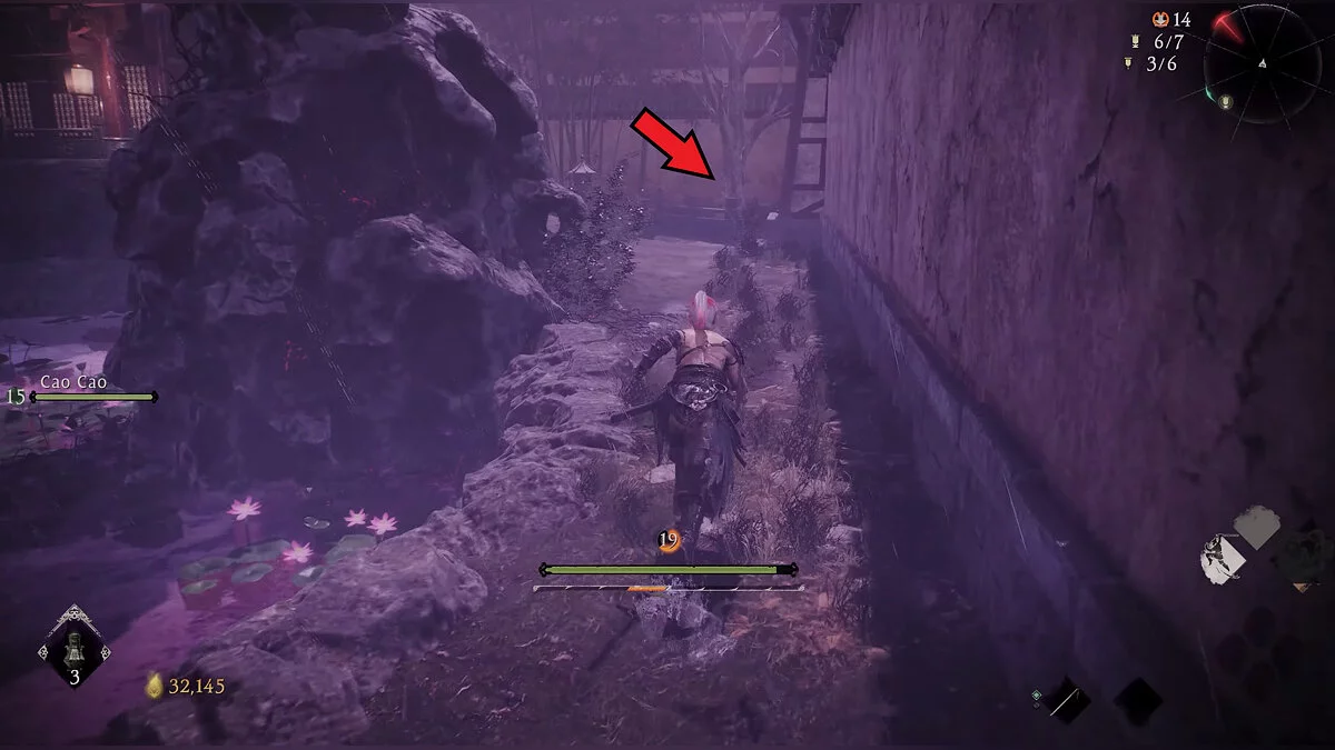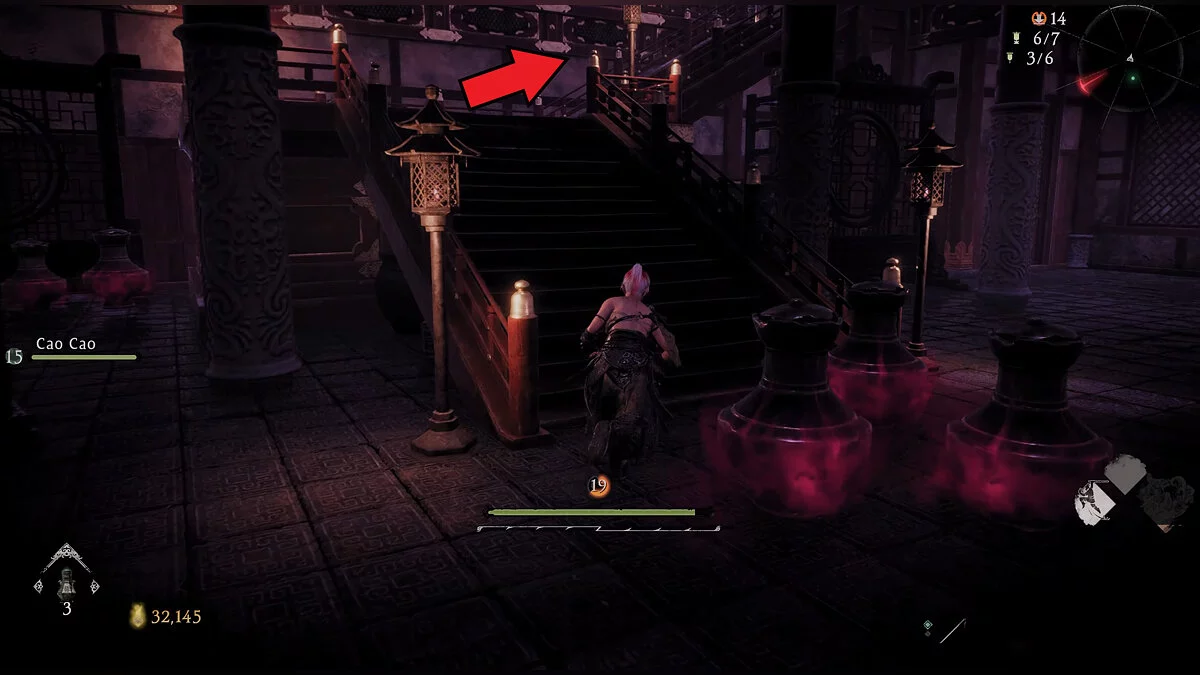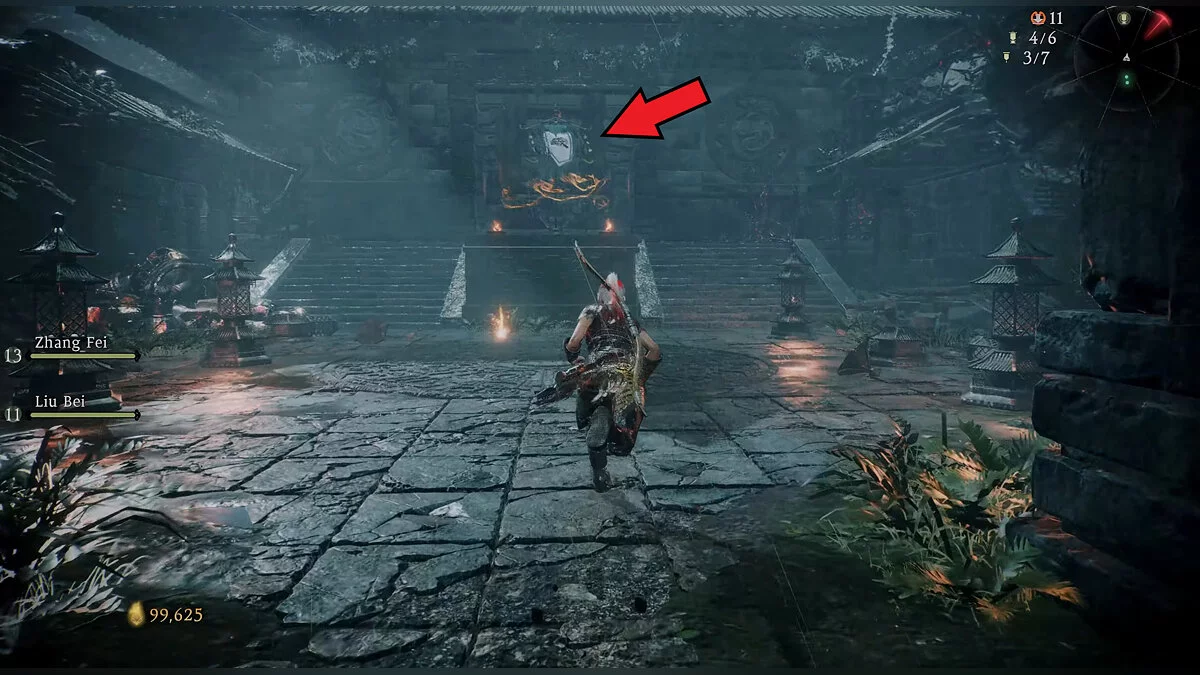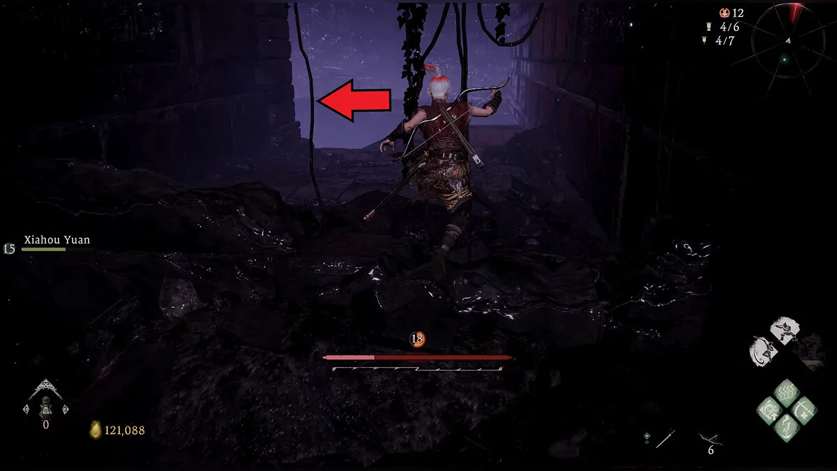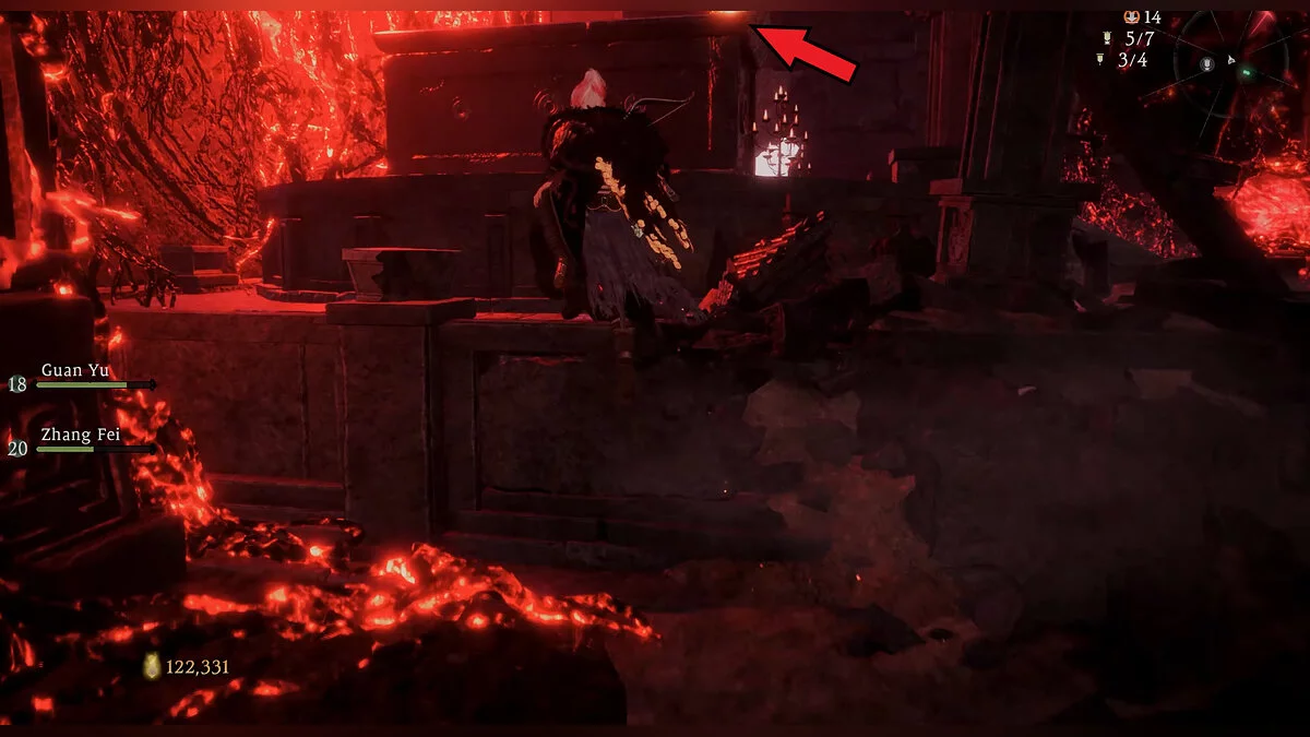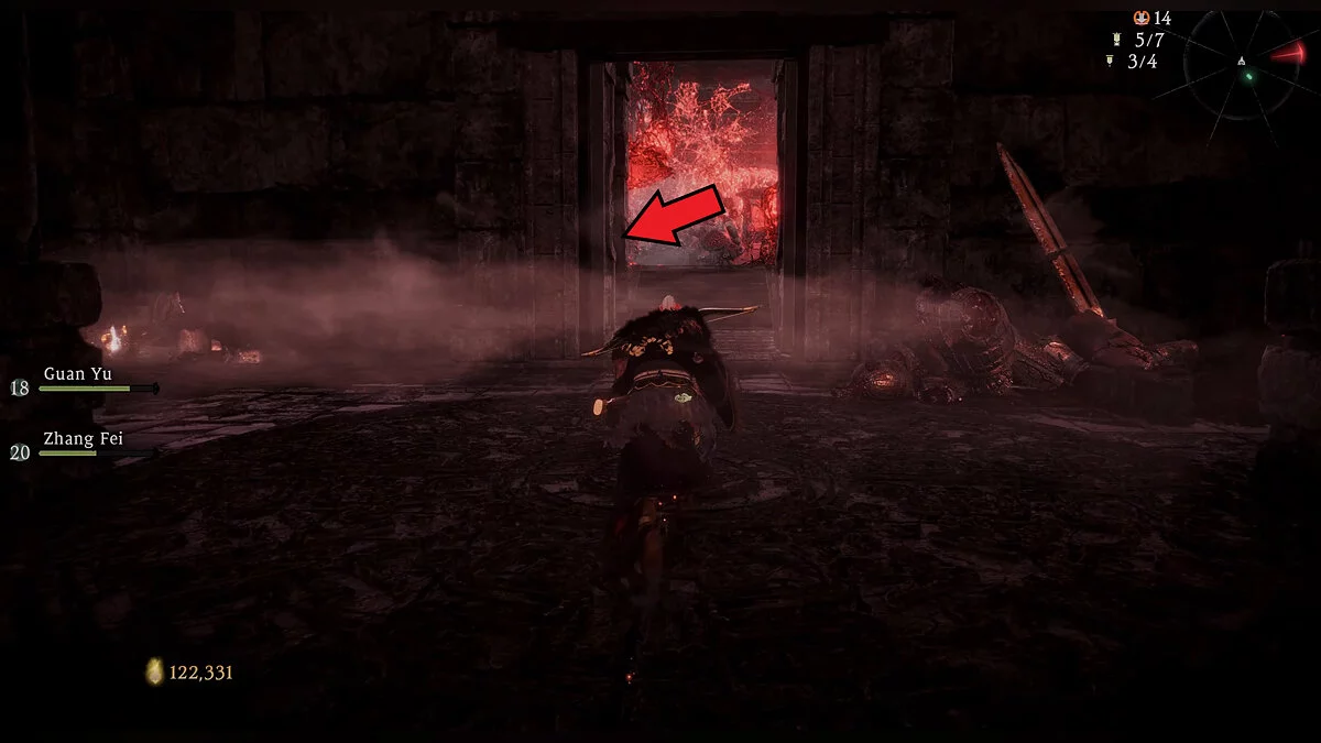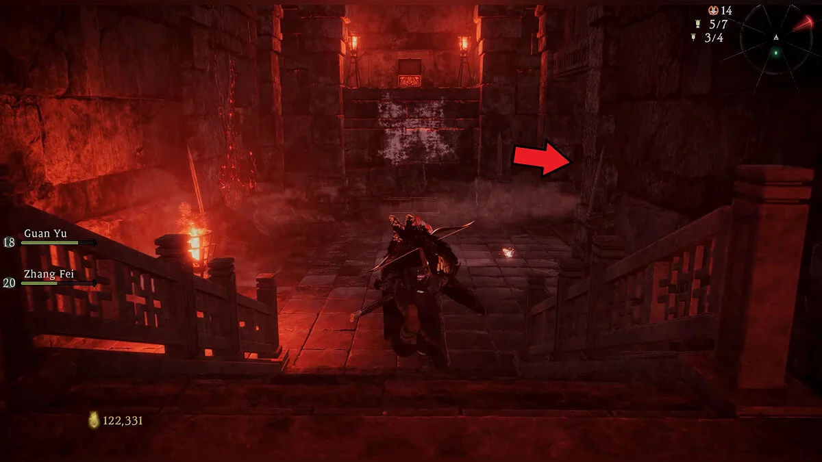 Миссия: «Решающая битва при Гуанду». Начинаем поиски от третьего боевого флага. Рядом с ним вы увидите большой дополнительный путь, по которому можно пройти через красные демонические лозы. Следуйте за ними до двойной двери, которую вы можете разблокировать. Продолжайте двигаться по лозам от небольшой двери влево, а затем спрыгивайте вниз. Далее шагайте по земле к следующим красным лозам растущим в левом направлении. Так вы доберетесь до арены с дополнительным боссом. Не идите к нему сразу и сначала изучите дом, который стоит рядом. Внутри него есть сундук с эссенцией.