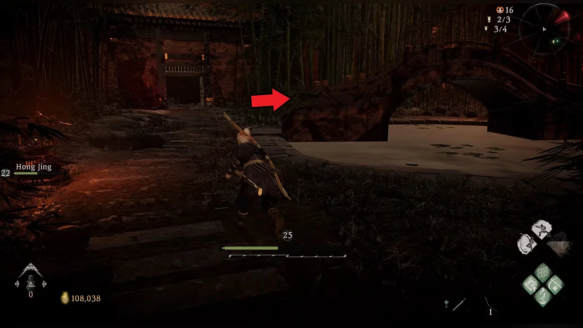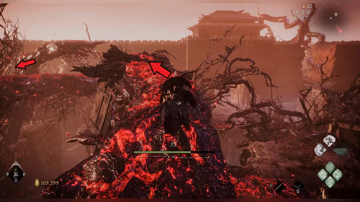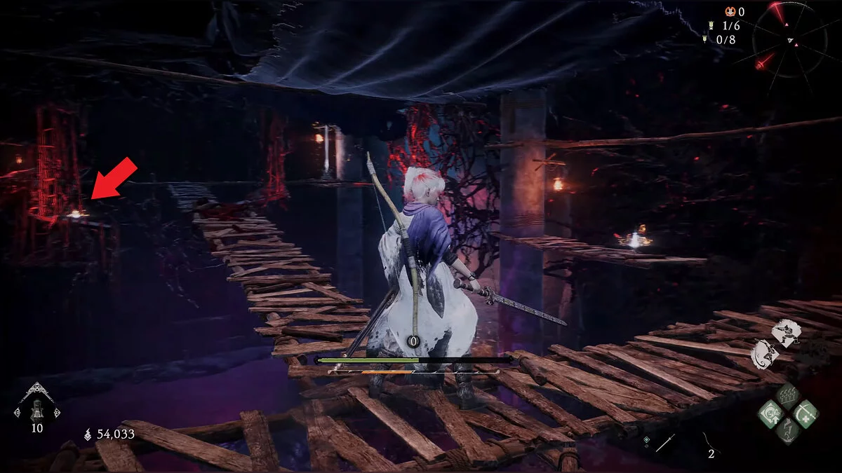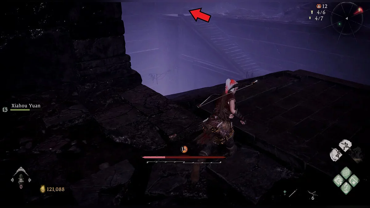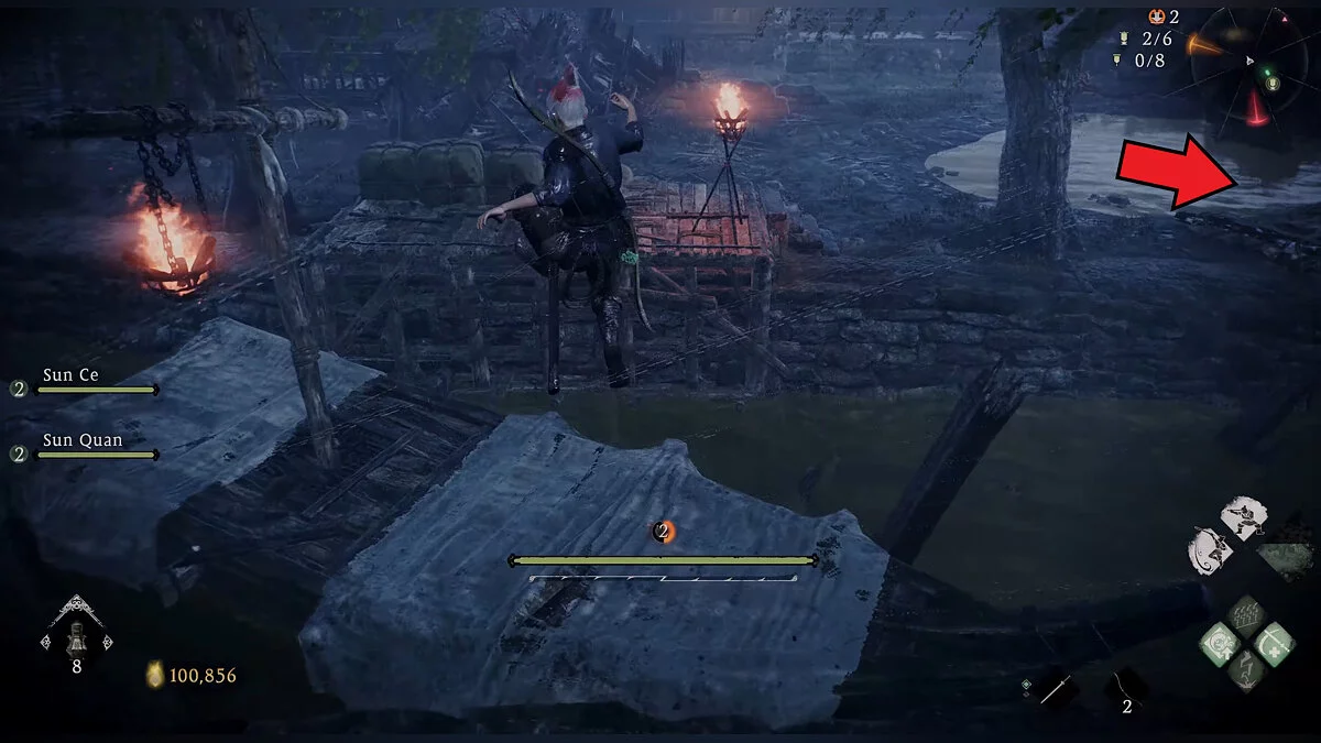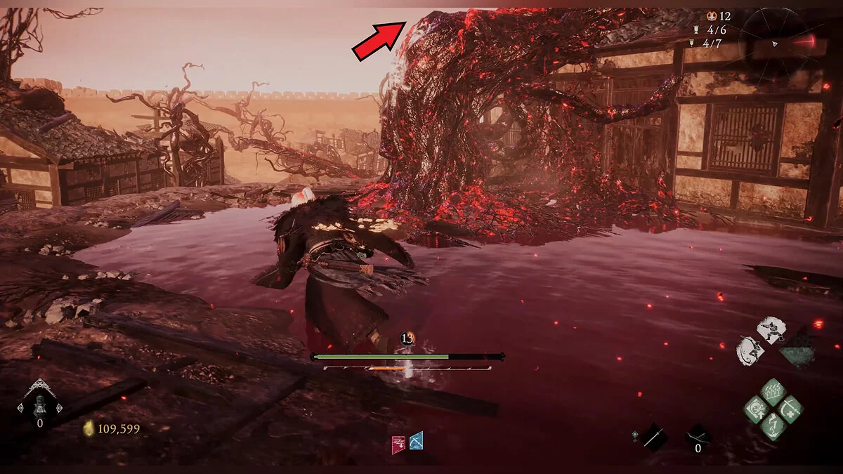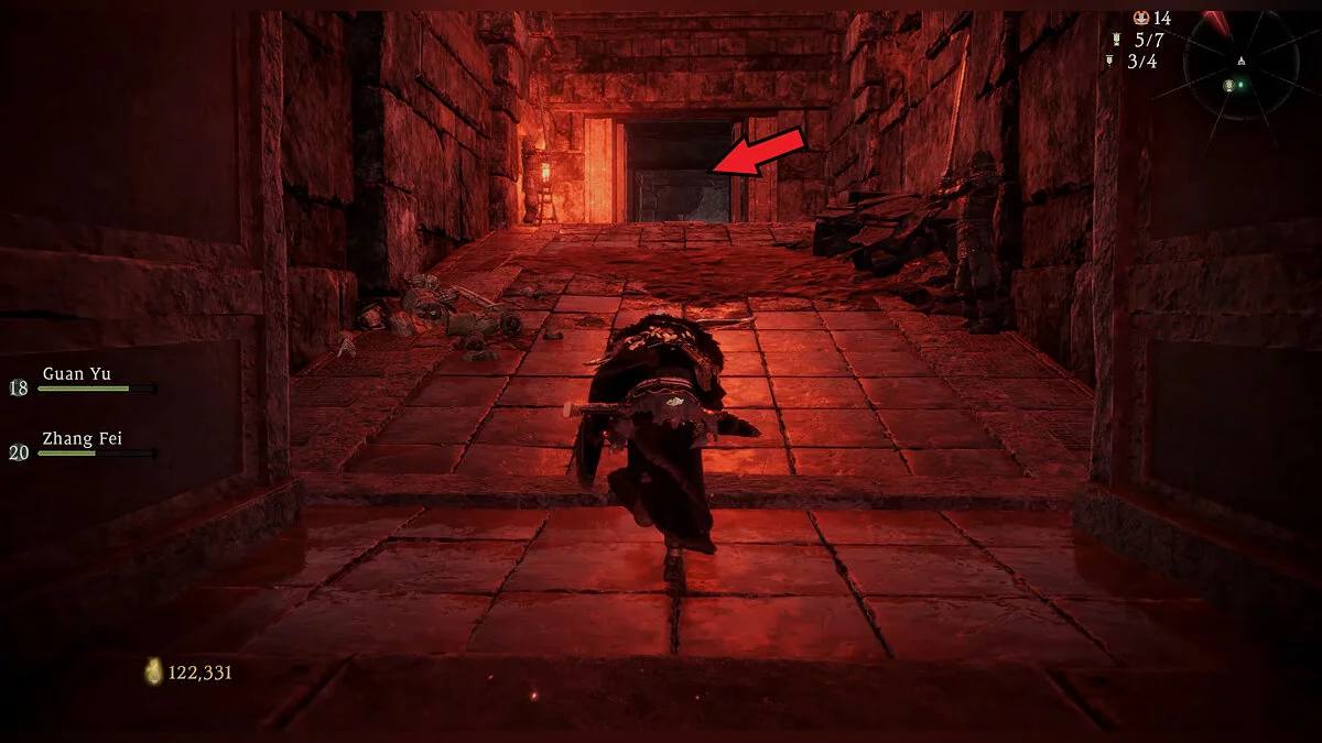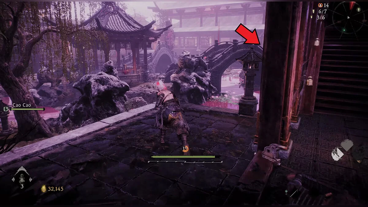Миссия: «Решающая битва при Гуанду». Начинаем поиски от третьего боевого флага. Рядом с ним вы увидите большой дополнительный путь, по которому можно пройти через красные демонические лозы. Следуйте за ними до двойной двери, которую вы можете разблокировать. Продолжайте двигаться по лозам от небольшой двери влево, а затем спрыгивайте вниз. Далее шагайте по земле к следующим красным лозам растущим в левом направлении. Так вы доберетесь до арены с дополнительным боссом. Не идите к нему сразу и сначала изучите дом, который стоит рядом. Внутри него есть сундук с эссенцией.