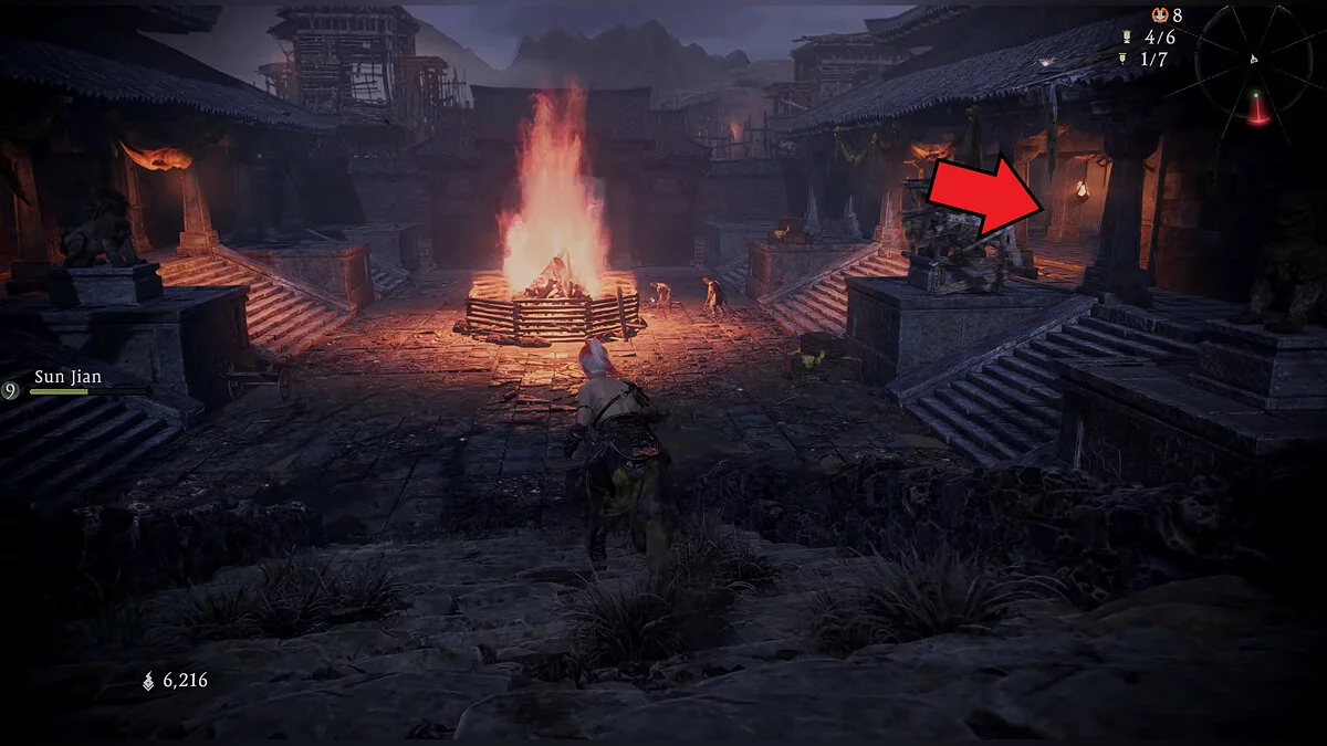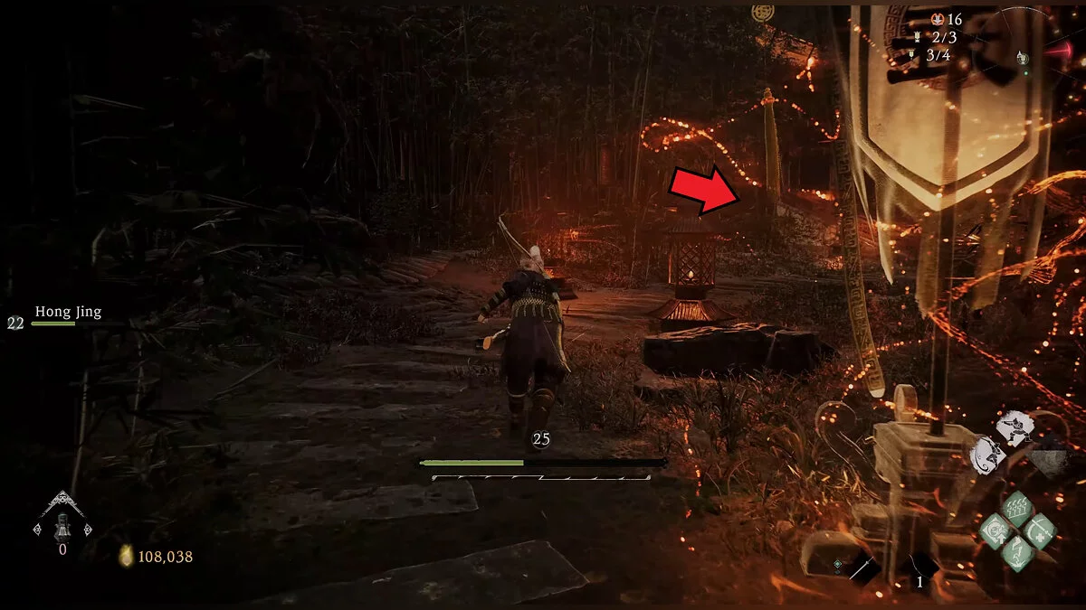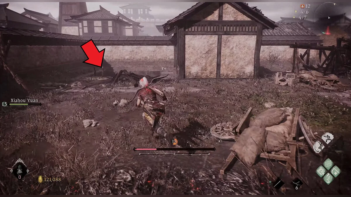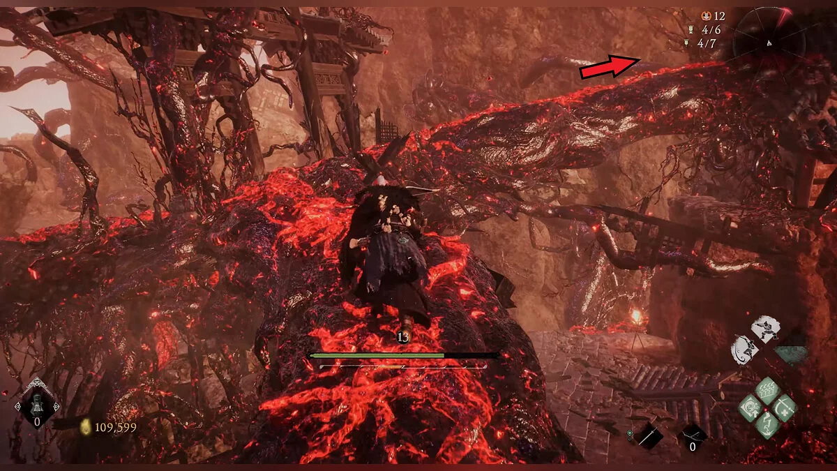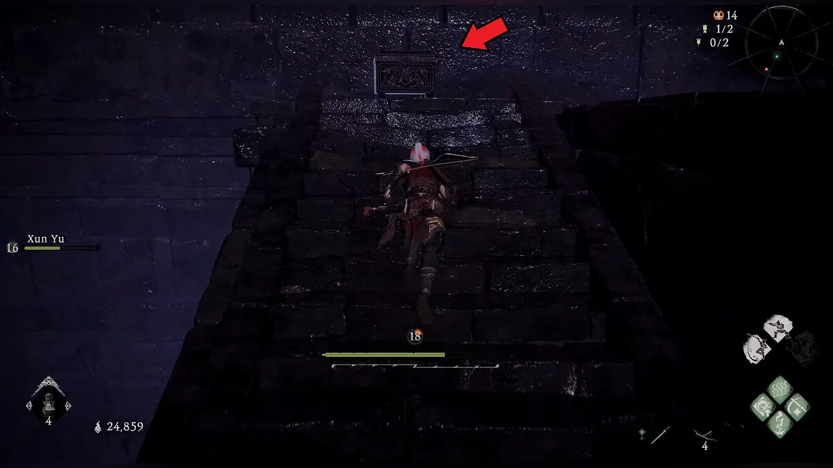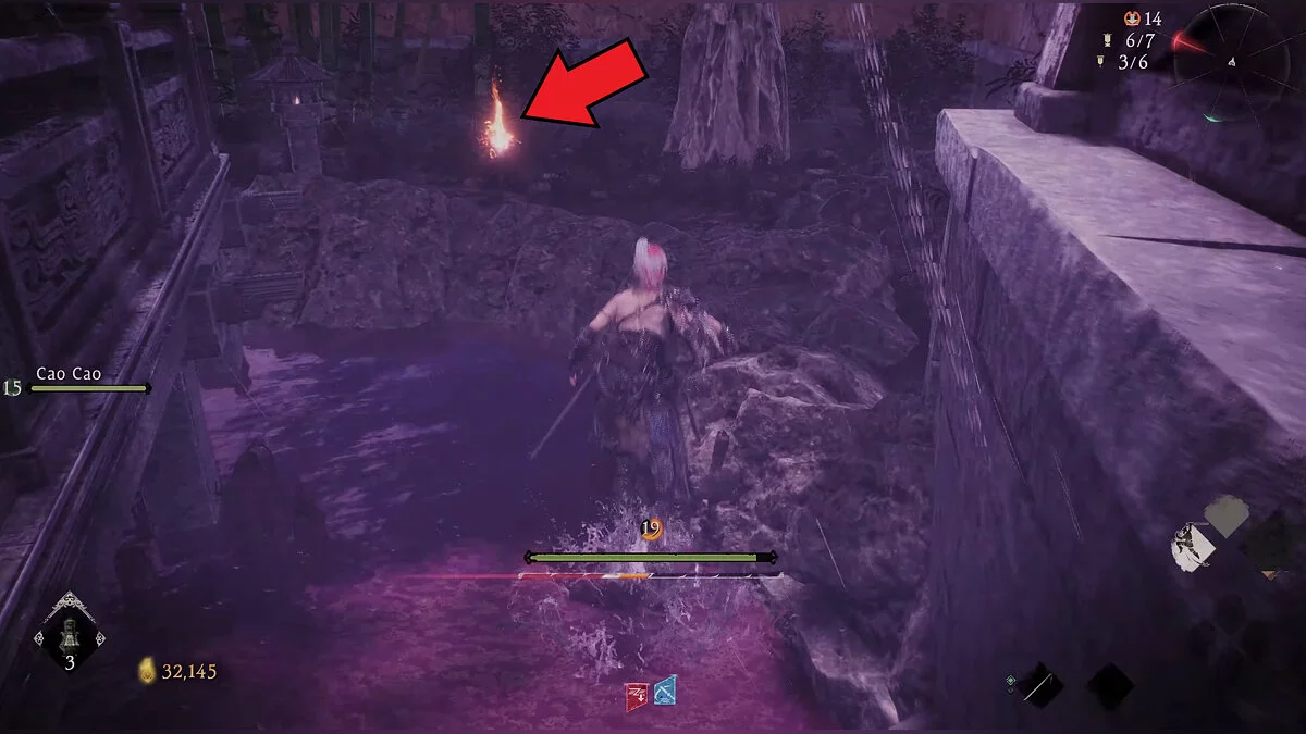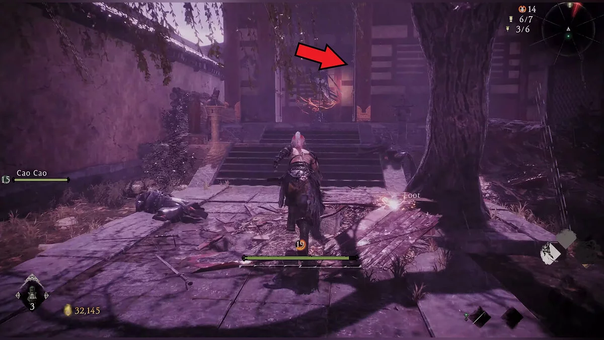 Миссия: «Решающая битва при Гуанду». Начинаем поиски от третьего боевого флага. Рядом с ним вы увидите большой дополнительный путь, по которому можно пройти через красные демонические лозы. Следуйте за ними до двойной двери, которую вы можете разблокировать. Продолжайте двигаться по лозам от небольшой двери влево, а затем спрыгивайте вниз. Далее шагайте по земле к следующим красным лозам растущим в левом направлении. Так вы доберетесь до арены с дополнительным боссом. Не идите к нему сразу и сначала изучите дом, который стоит рядом. Внутри него есть сундук с эссенцией.
