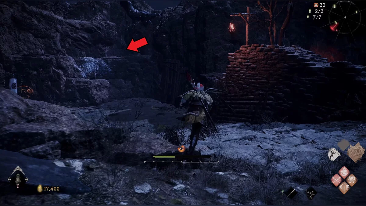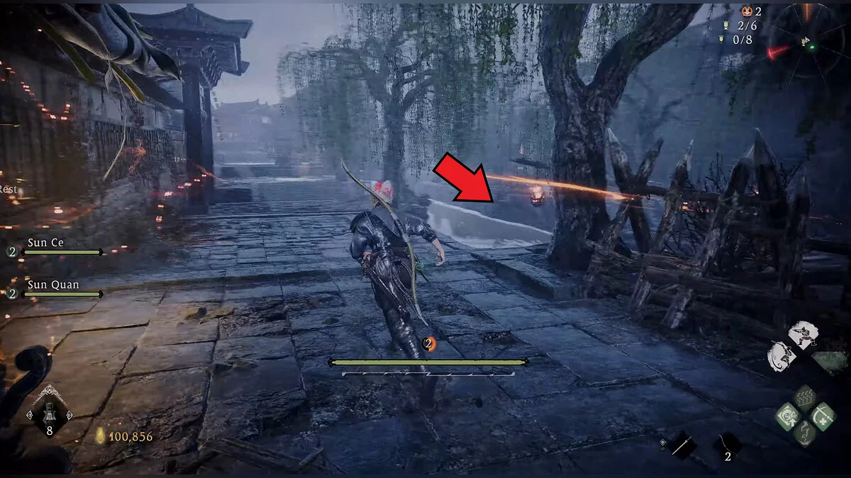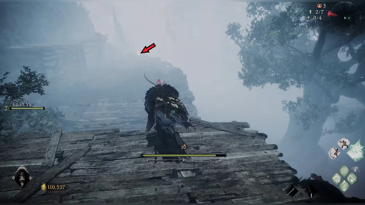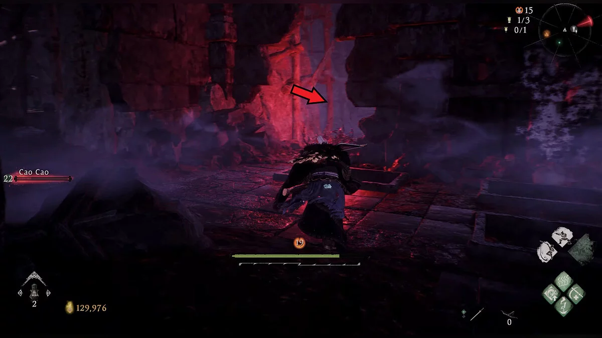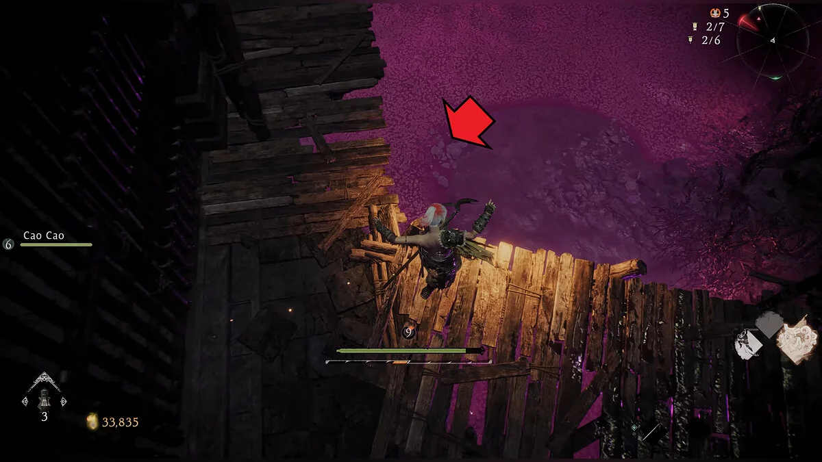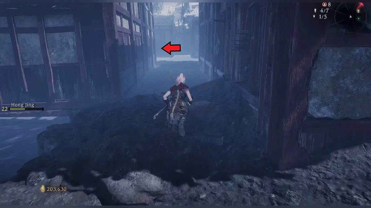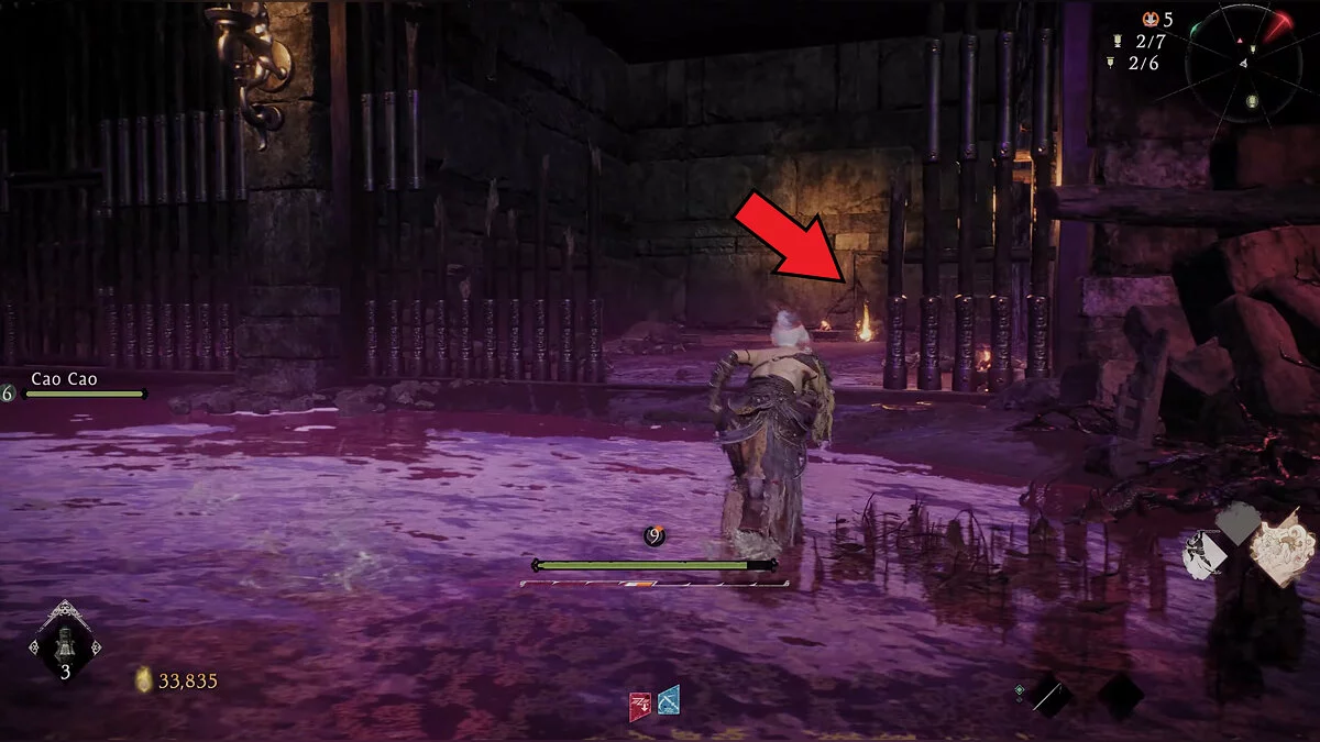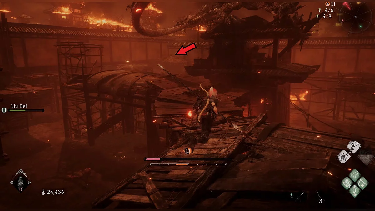 Миссия: «Решающая битва при Гуанду». Начинаем поиски от третьего боевого флага. Рядом с ним вы увидите большой дополнительный путь, по которому можно пройти через красные демонические лозы. Следуйте за ними до двойной двери, которую вы можете разблокировать. Продолжайте двигаться по лозам от небольшой двери влево, а затем спрыгивайте вниз. Далее шагайте по земле к следующим красным лозам растущим в левом направлении. Так вы доберетесь до арены с дополнительным боссом. Не идите к нему сразу и сначала изучите дом, который стоит рядом. Внутри него есть сундук с эссенцией.