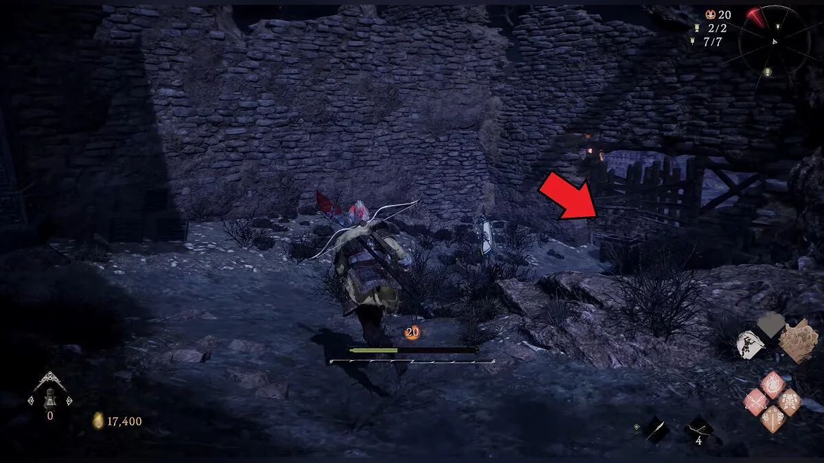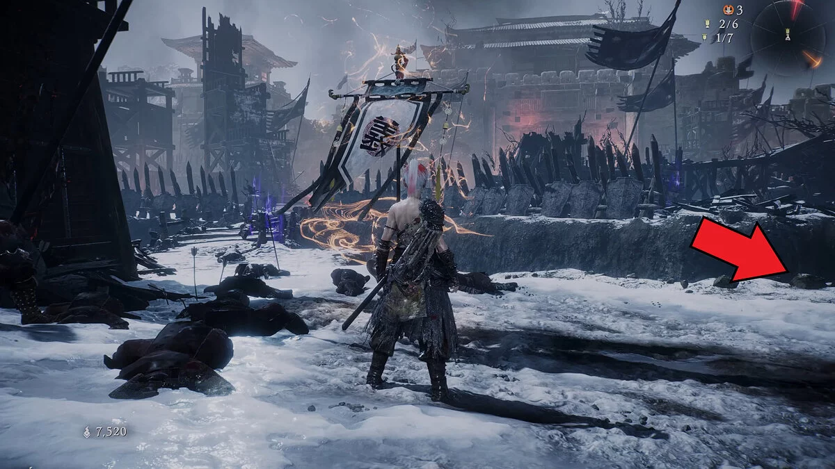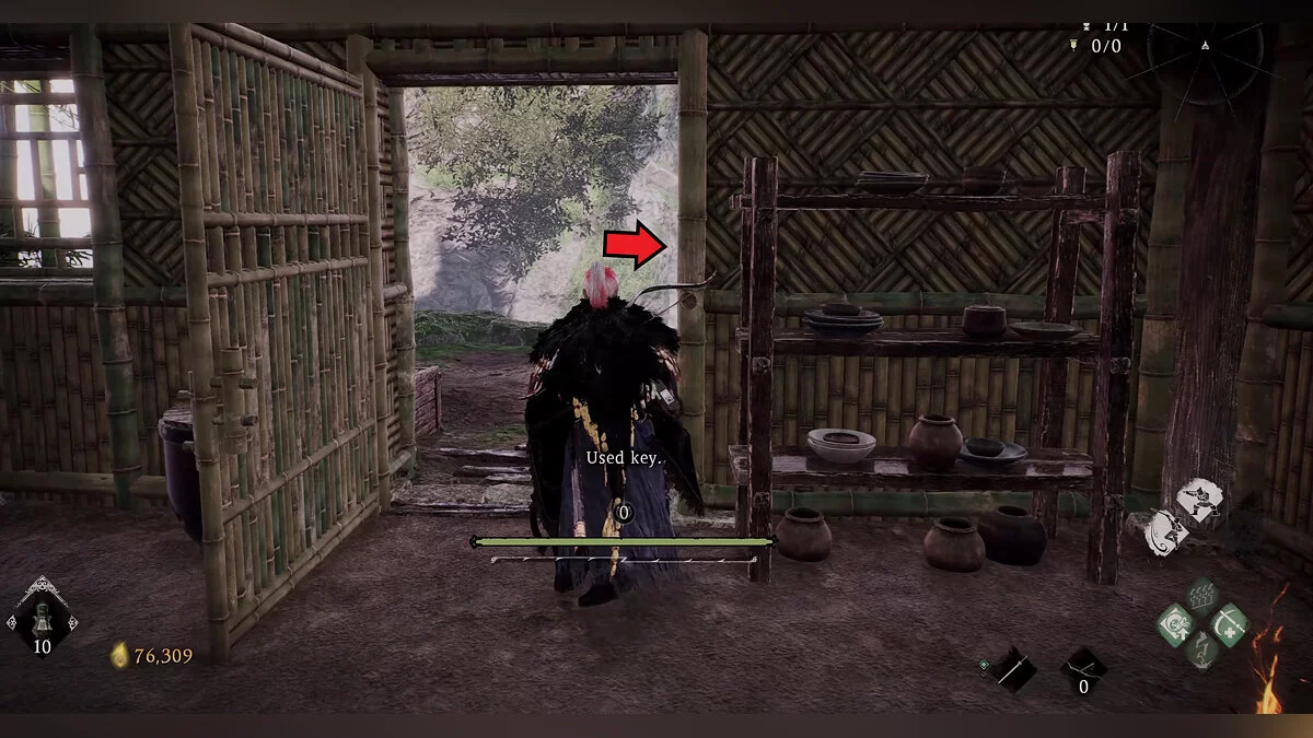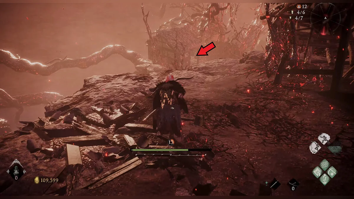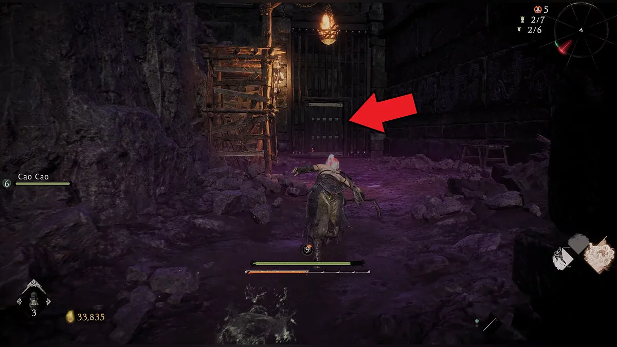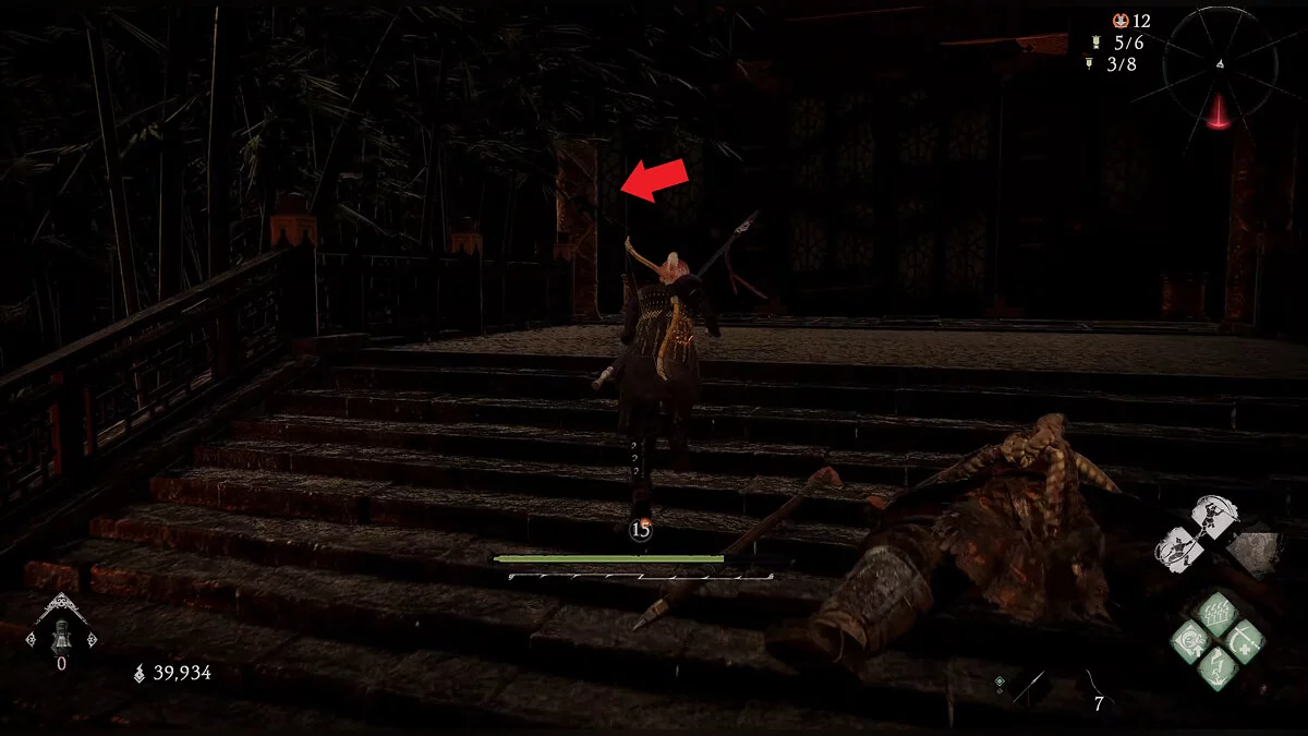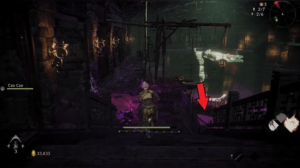 Миссия: «Решающая битва при Гуанду». Начинаем поиски от третьего боевого флага. Рядом с ним вы увидите большой дополнительный путь, по которому можно пройти через красные демонические лозы. Следуйте за ними до двойной двери, которую вы можете разблокировать. Продолжайте двигаться по лозам от небольшой двери влево, а затем спрыгивайте вниз. Далее шагайте по земле к следующим красным лозам растущим в левом направлении. Так вы доберетесь до арены с дополнительным боссом. Не идите к нему сразу и сначала изучите дом, который стоит рядом. Внутри него есть сундук с эссенцией.