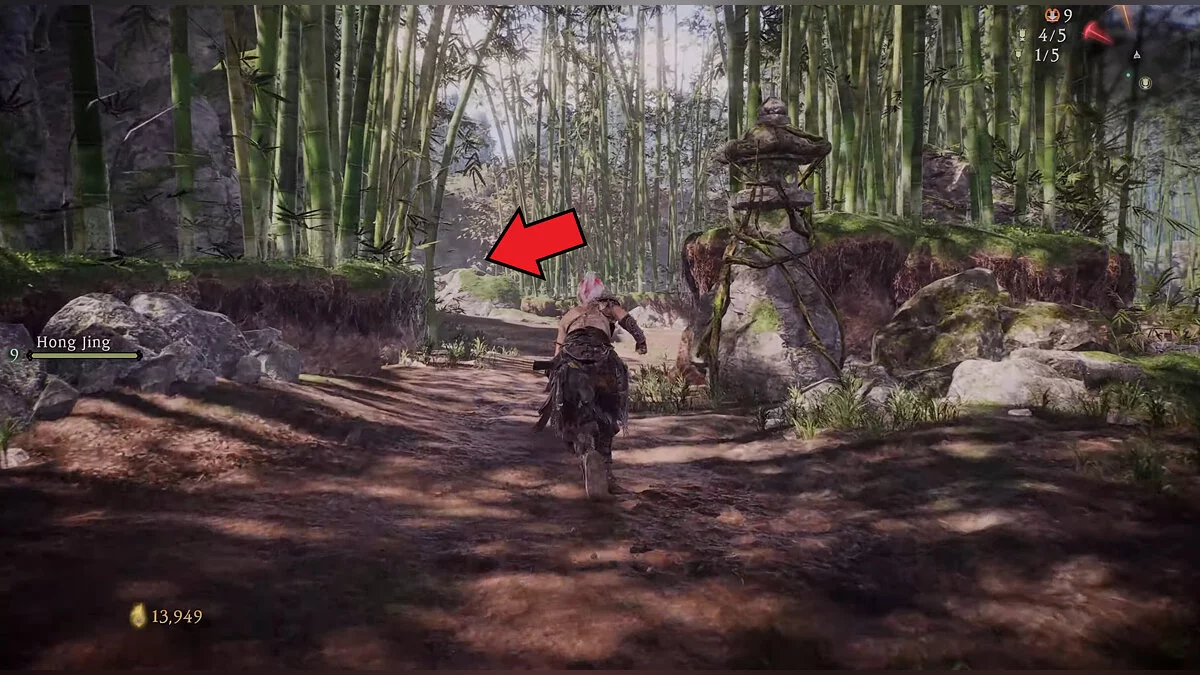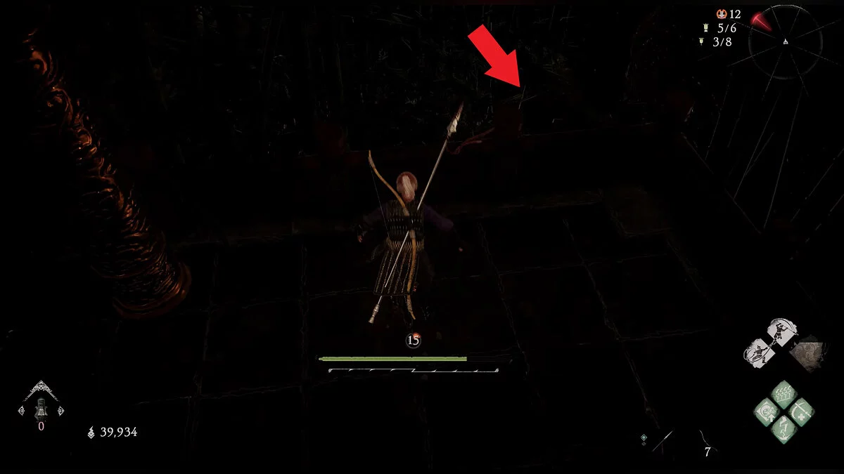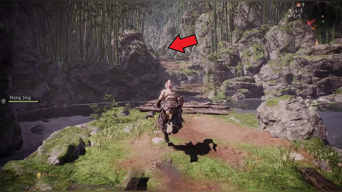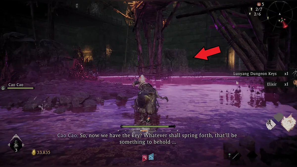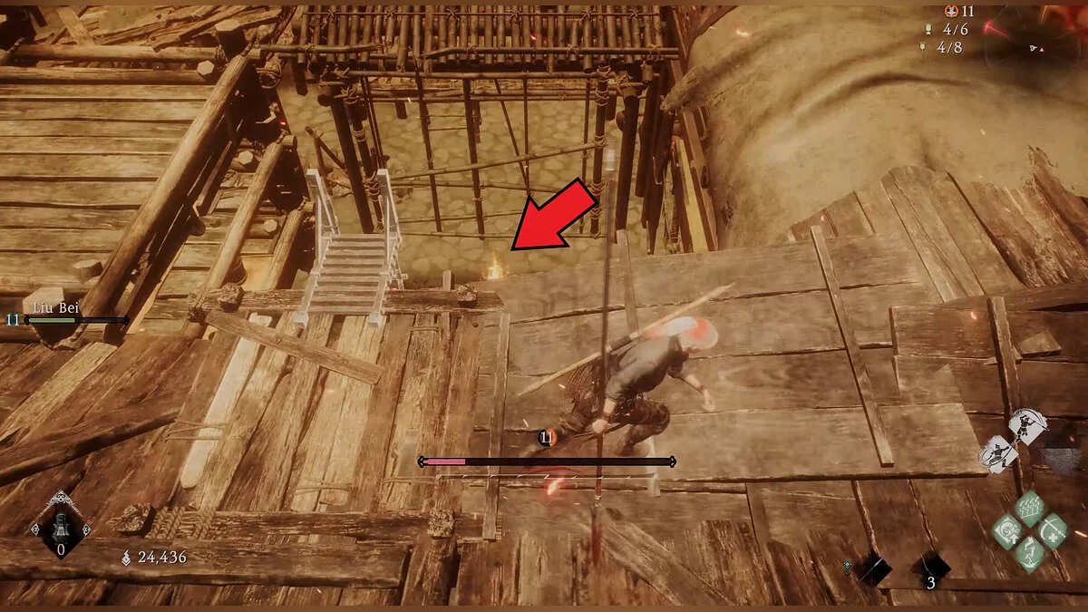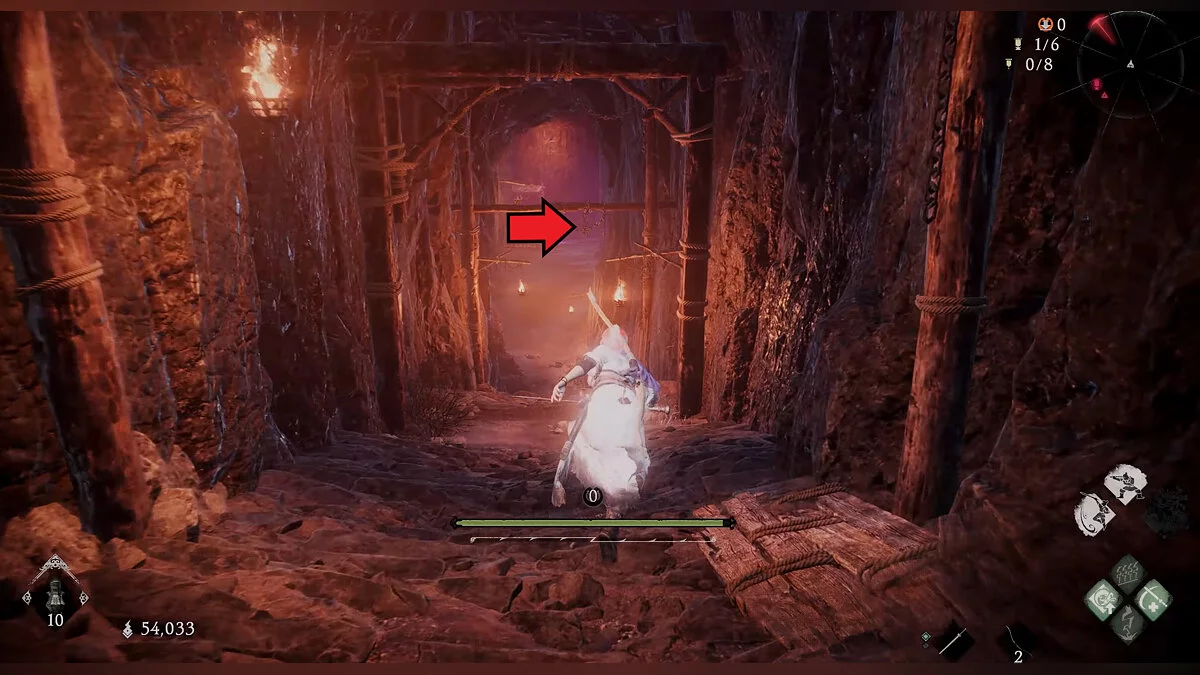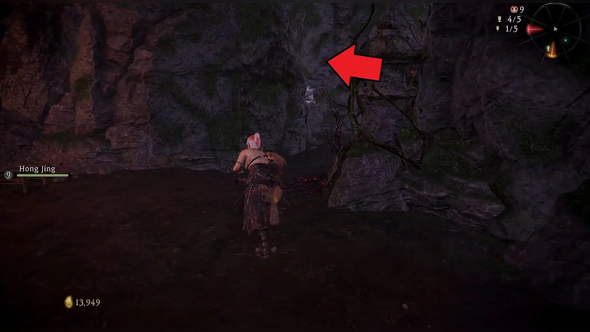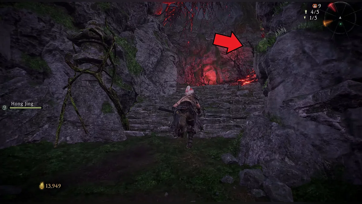 Миссия: «Решающая битва при Гуанду». Начинаем поиски от третьего боевого флага. Рядом с ним вы увидите большой дополнительный путь, по которому можно пройти через красные демонические лозы. Следуйте за ними до двойной двери, которую вы можете разблокировать. Продолжайте двигаться по лозам от небольшой двери влево, а затем спрыгивайте вниз. Далее шагайте по земле к следующим красным лозам растущим в левом направлении. Так вы доберетесь до арены с дополнительным боссом. Не идите к нему сразу и сначала изучите дом, который стоит рядом. Внутри него есть сундук с эссенцией.