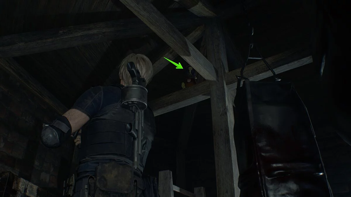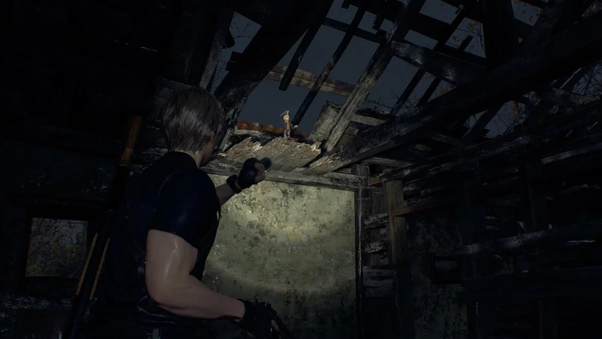 Первая кукла будет находиться на разрушенной крыше одного из деревенских зданий в Поселении у озера. Попасть в дом вы можете через окно.