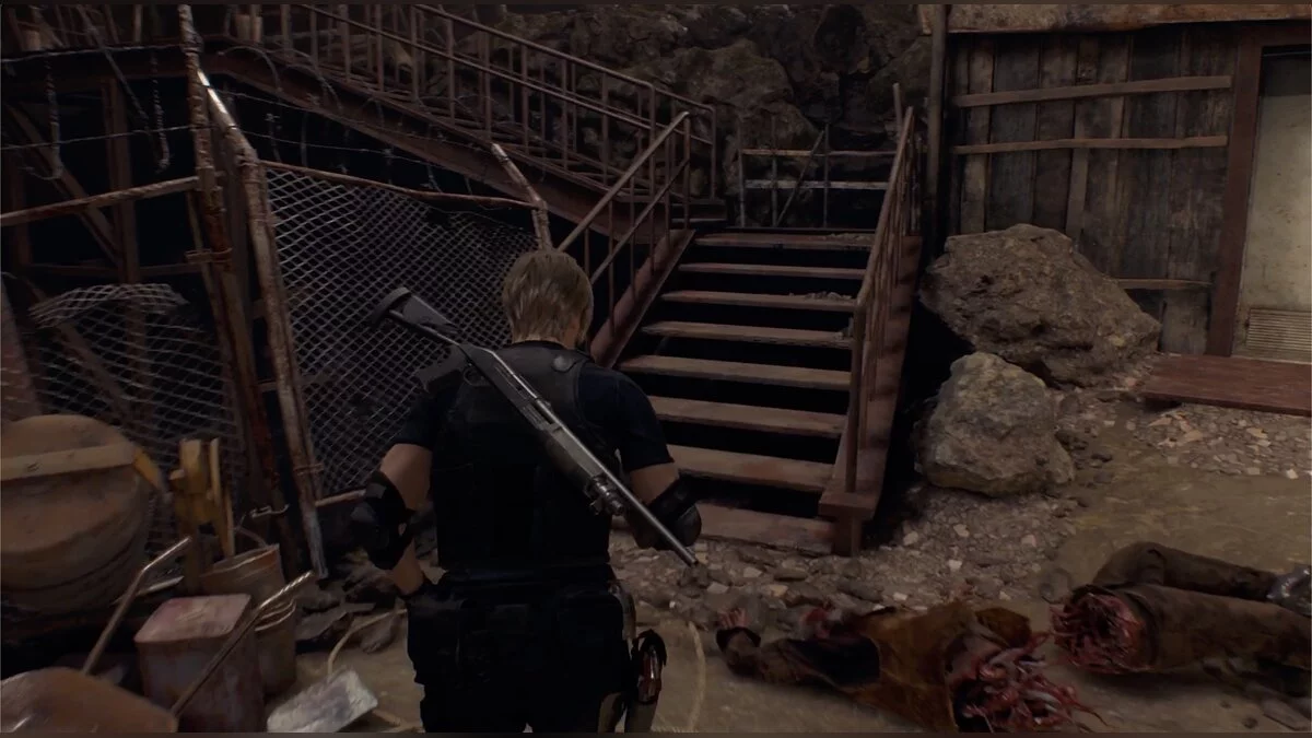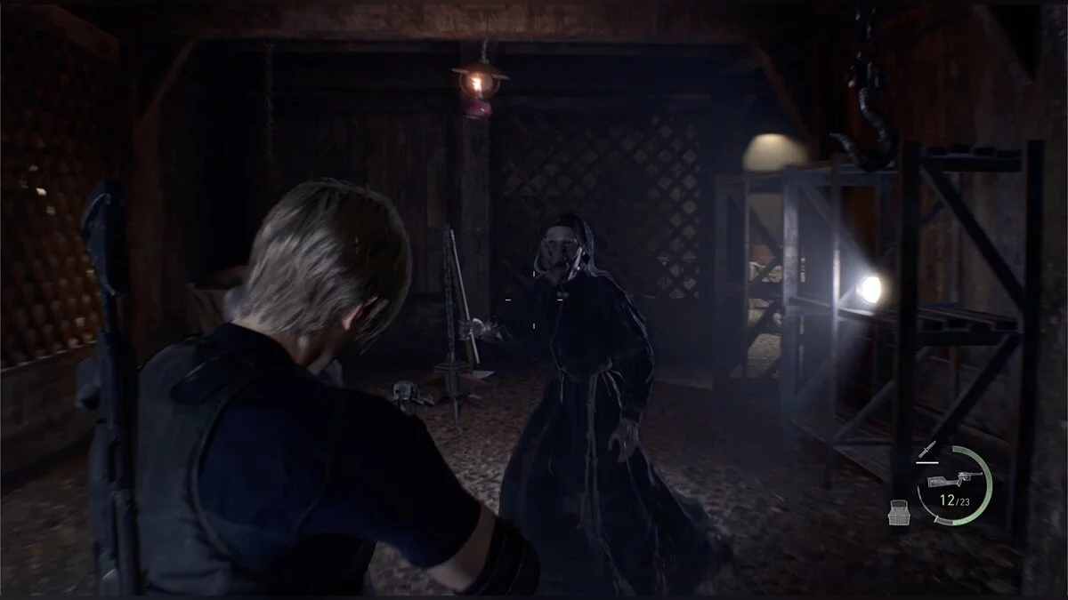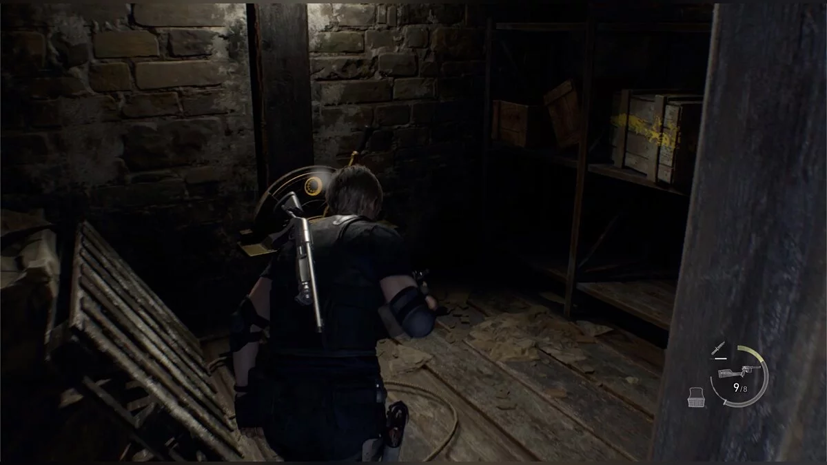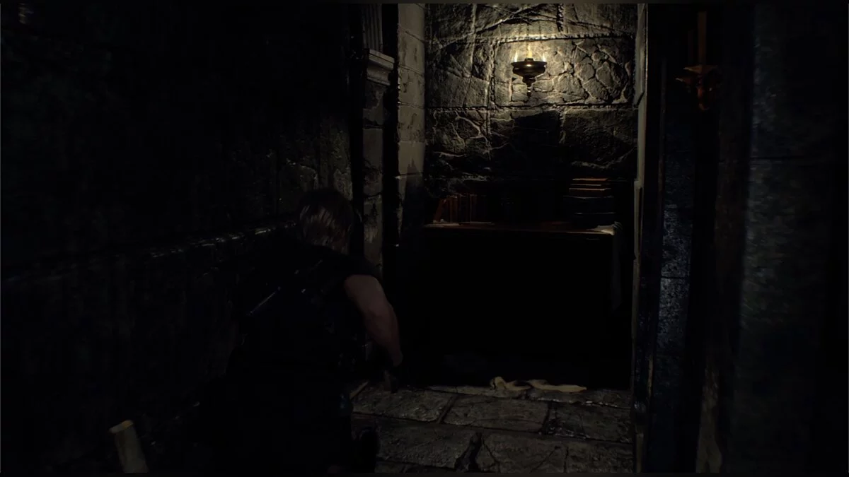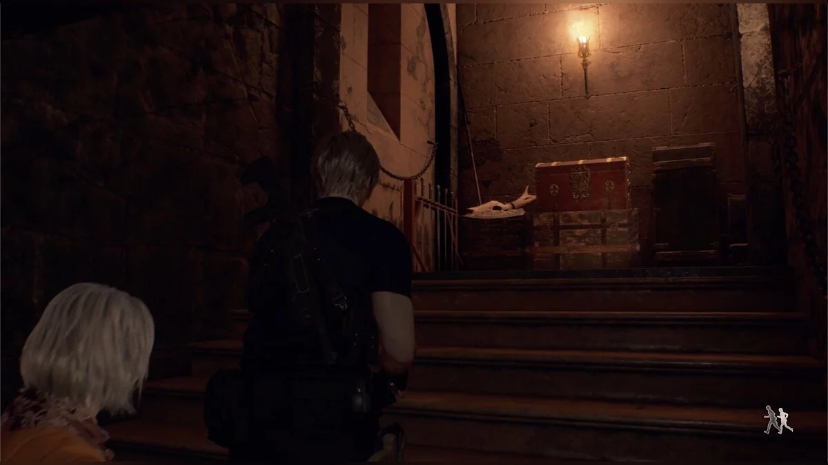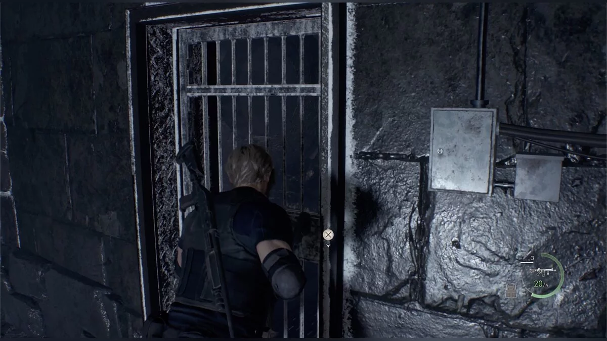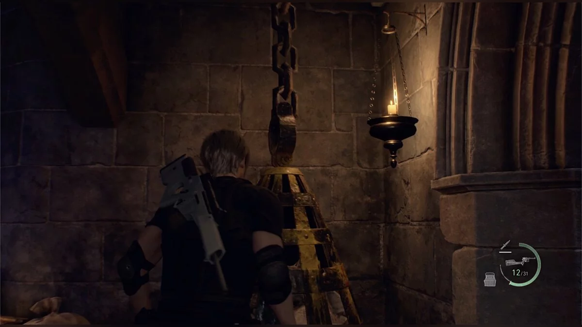 После кат-сцены вы окажетесь в новом месте и без снаряжения. У вас только один путь вперед. Заберите из трупа кухонный нож — он пригодится. Поднимайтесь по лестнице и откройте решетку, впереди враги, однако они вас не ждут. Время обучиться местному стелсу. Победив крестьянина, Леон заметит в другой комнате свои вещи.