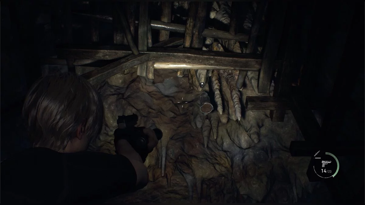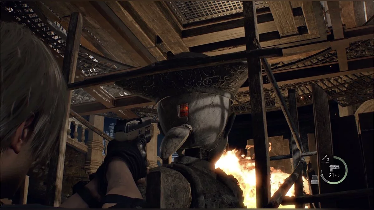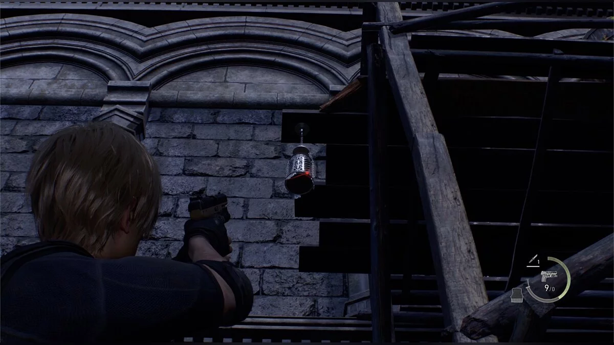 В этой зоне есть несколько капканов, в которые можно заманить противника. На лестнице впереди растяжка. Леон без проблем пройдет под ней, если присядет, а вот крестьянин получит урон. Для победы стреляйте в голову, блокируйте прямые атаки ножом и бейте вовремя ногой.