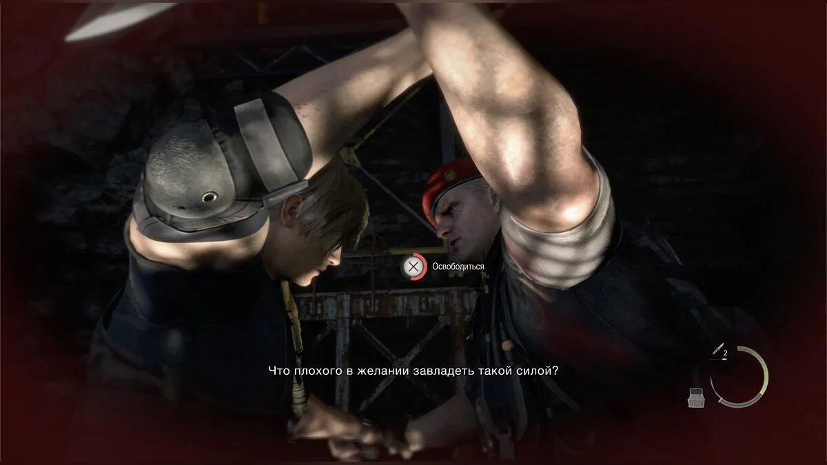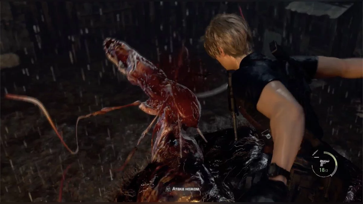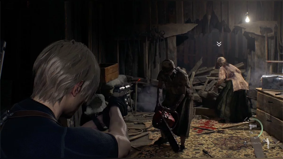 Тактика сражения зависит от количества противников. Если врагов немного — стреляйте в голову. Зараженный не умрет, но будет оглушен. Подойдите к нему вплотную и ударьте ногой. Если же злобных крестьян много — выцеливать их времени не будет. По возможности стреляйте в голову, но не останавливайтесь даже после оглушения. Выпады оружием можно блокировать ножом. В нужный момент в правом нижнем углу будет загораться кнопка.