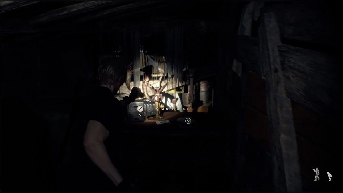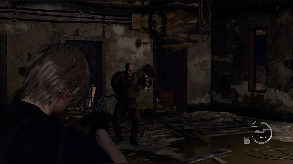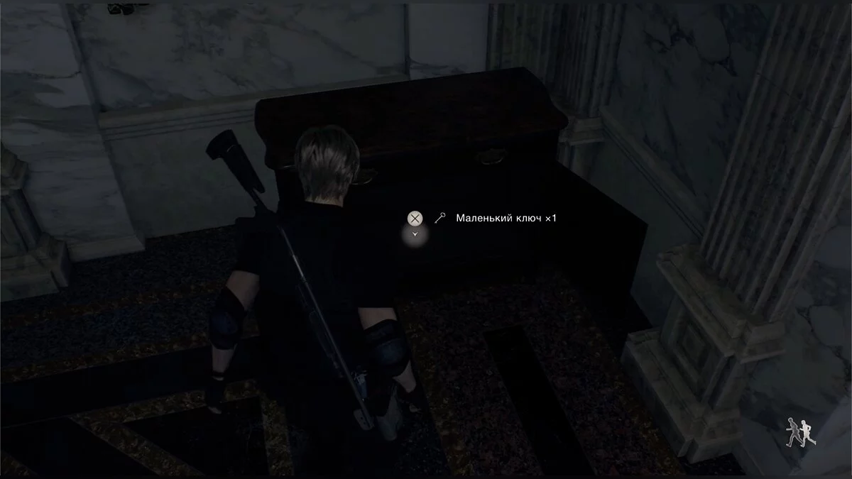 Вам нужно держаться правой стороны и двигаться к дому впереди. Дверь окажется запертой, поэтому обойдите её справа и перепрыгните через окно. Внутри тоже будут враги. Здесь же можно найти маленький ключ. Это расходник, который тратится всякий раз, когда Леон открывает обычные запертые ящики.