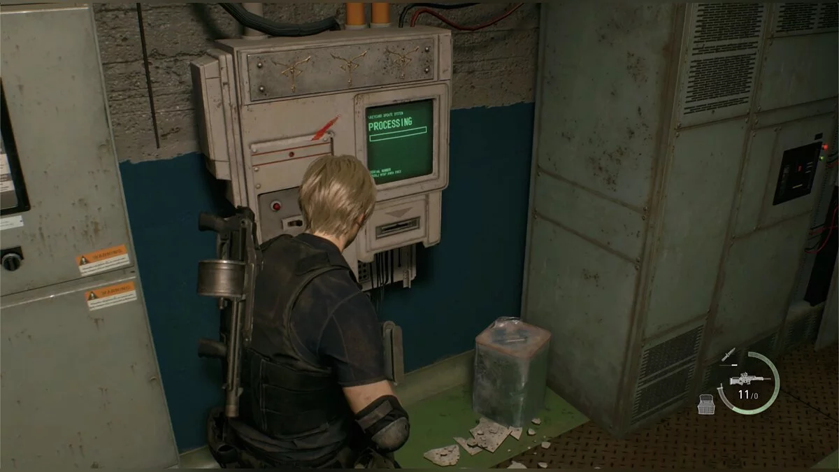 Продолжайте идти вперед и увидите панель, переключающую питание в локации. Нажмите рычаг и сразу же повернитесь налево. На другой стороне появятся враги, нужно защищать Эшли. Двигайтесь назад к девушке, почти сразу на вас нападет регенерирующий мутант. Теперь можете решить ранее неактивную головоломку. Как и раньше комбинация зависит от сложности игры. Просто повторите изображения со скриншотов ниже.