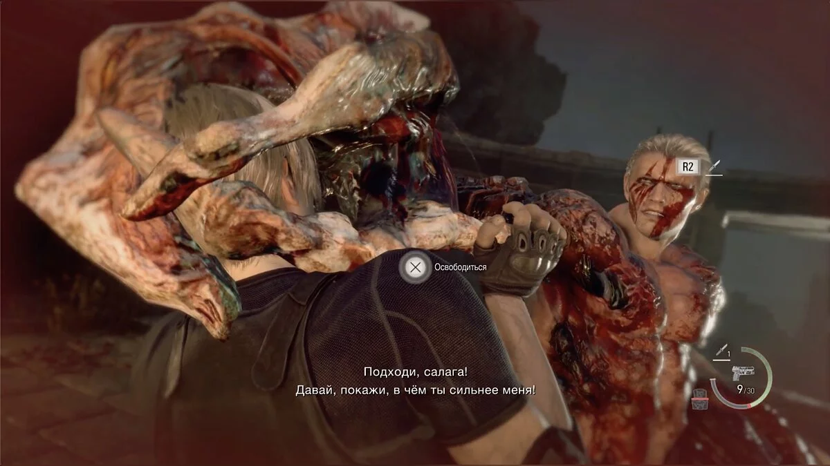 На второй стадии босс уже не будет двигаться. В центре щупалец появится большой шар/глаз — стреляйте только туда. Периодически необходимо уклоняться от ударов отростков. Дождитесь, когда Ада бросит вам ракетницу и сразу же используйте ее. Бой завершен.