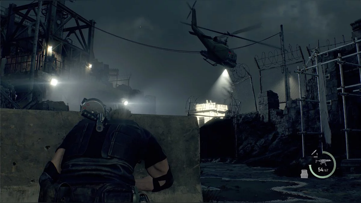 Из руин поднимайтесь наверх. Вы окажетесь в начале большой базы. Начните атаку, неожиданно прилетит вертолет с пилотом Майком. Он будет вам помогать. Ваша задача — выманивать зараженных на открытую местность, чтобы Майк мог их расстрелять. Как и раньше отличной тактикой станет стрельба по ногам — это сэкономит патроны и даст время пилоту прицелиться. В доме на втором этаже есть пулемет, можете им также воспользоваться. Осмотрите заднюю сторону дома, там висит клетка с красным бериллом.