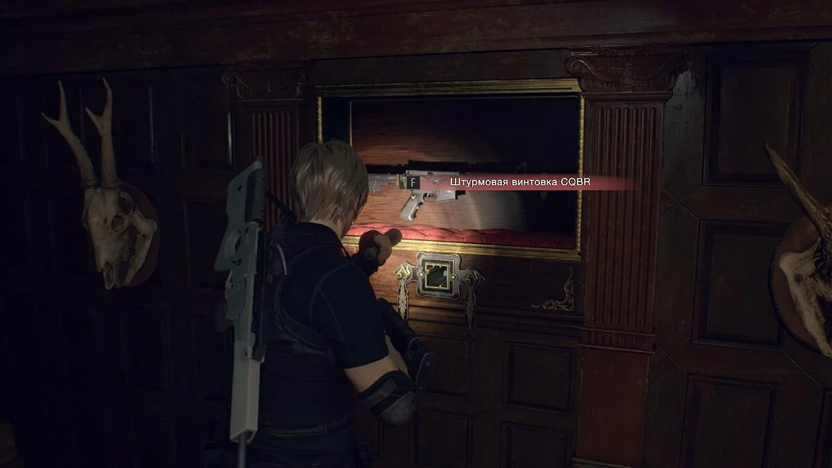 Для получения этого оружия вам придётся отыскать кубическое устройство и решить небольшую головоломку в библиотеке. Следуйте к месту, где Эшли подобрала связку ключей. Напротив стола, где находились ключи, есть картина с небольшим углублением. Используйте комбинацию, которая указана на скриншоте ниже, чтобы открыть тайник и забрать оружие.