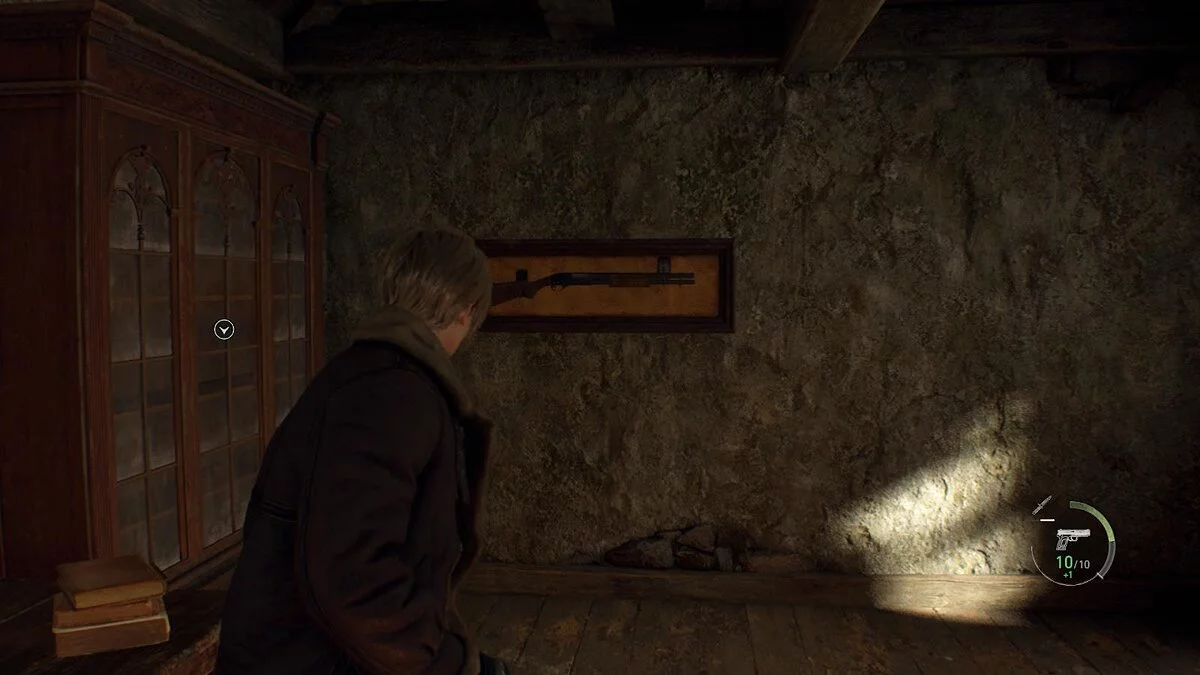 Его можно найти на деревенской площади после того, как зайдёте в дальний дом слева. В этот же момент появится враг с бензопилой. Поднимитесь по единственной в здании лестнице и осмотрите стену справа от комода. Здесь висит ружьё.
