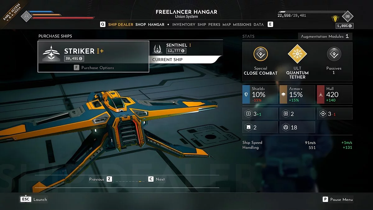 Примечание: Если вы покупаете Страйкер I в Ангаре Фрилансера (Freelancer Hangar) в Системе Союза (Union System), у него будет другой скин, дизайн и пассивная особенность: активация ульты мгновенно восстанавливает 50% брони. Такой корабль доступен за 12 741 кредит.