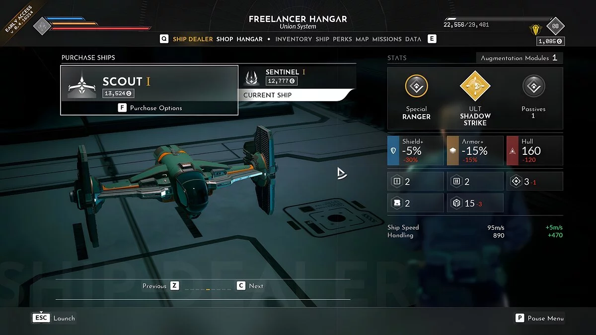 Представляет собой улучшенную версию стартового корабля с более высокими характеристиками: он оснащен более мощным щитом и бронёй, а также имеет повышенные очки корпуса. Если вам по нраву вид дефолтного летательного аппарата, то потребуется накопить 31 177 кредитов и отправиться на станцию Равнины Нефтис (Nephtys Plains), в Ангар Фрилансера (Freelancer Hangar).