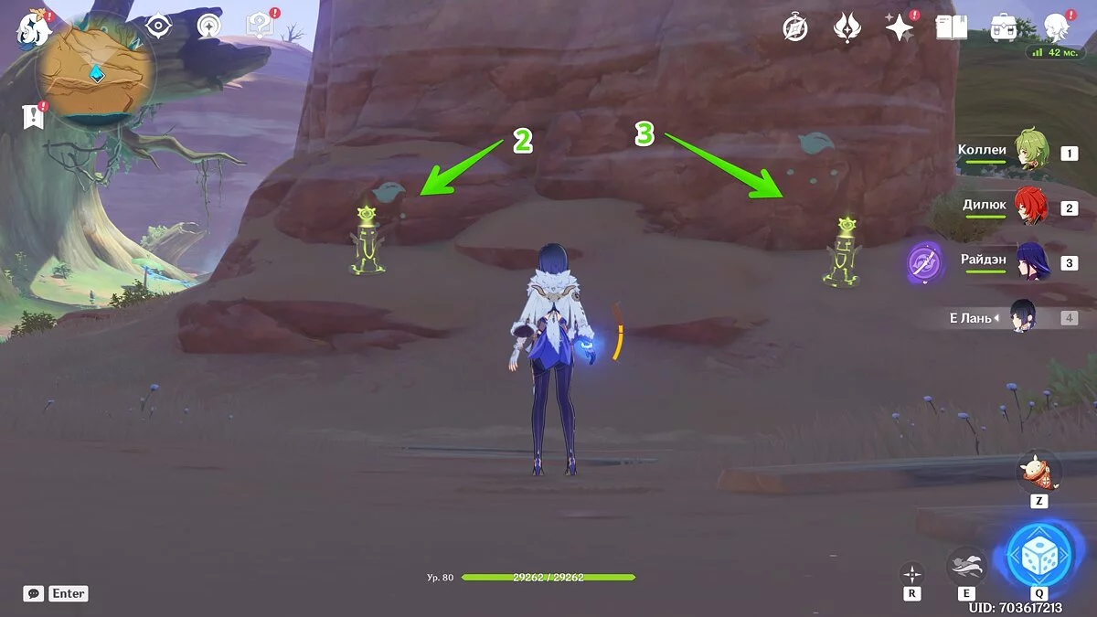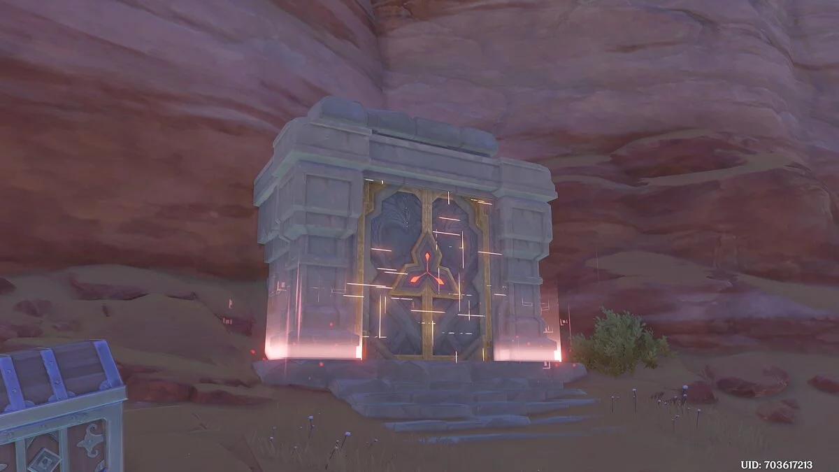 За большой скалой вы увидите запечатанный вход в данж и несколько дендро тотемов, которые следует активировать при помощи соответствующей стихии. Сделать это нужно в правильном порядке. Для этого можете воспользоваться подсказками, которые изображены позади каждой стойки. Количество точек на рисунках отражают последовательность активации.