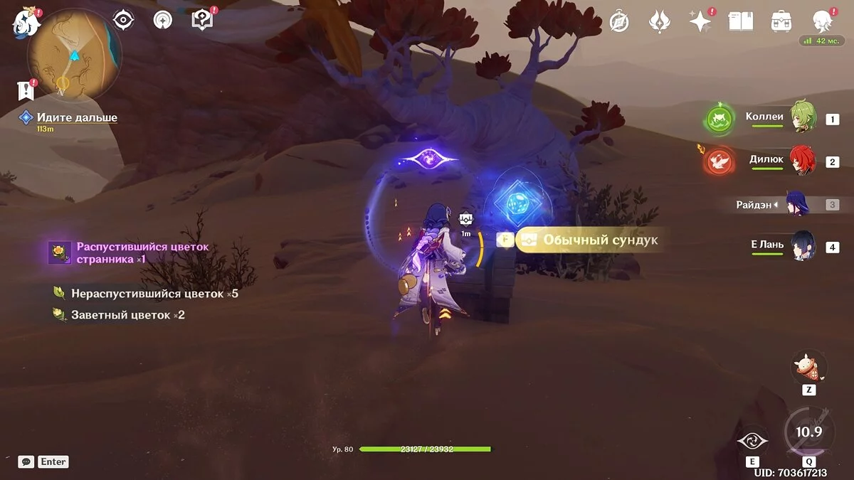 Здесь же возьмите ядро духа и подойдите к самому крайнему шару. Подберите шар сверху, вернитесь ко второму шару, который заперт кристаллом, и зажмите клавишу «Е». Так Соруш застынет на этом месте и подберёт энергию, как только вы вернётесь в облик путешественника. Останется лишь забрать последний шар с энергией, чтобы получить доступ к богатому сундуку.
