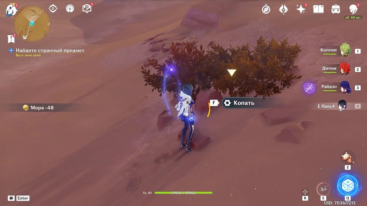 Когда вы будете подходить к нужному телепорту, Паймон произнесёт реплику, после чего и начнётся квест. Некоторые игроки сообщали, что реплика помощницы не активировала задание. В этом случае нужно развернуться и осмотреть куст неподалёку — рядом с телепортом он всего один. Нажмите «Копать», чтобы начать задание.