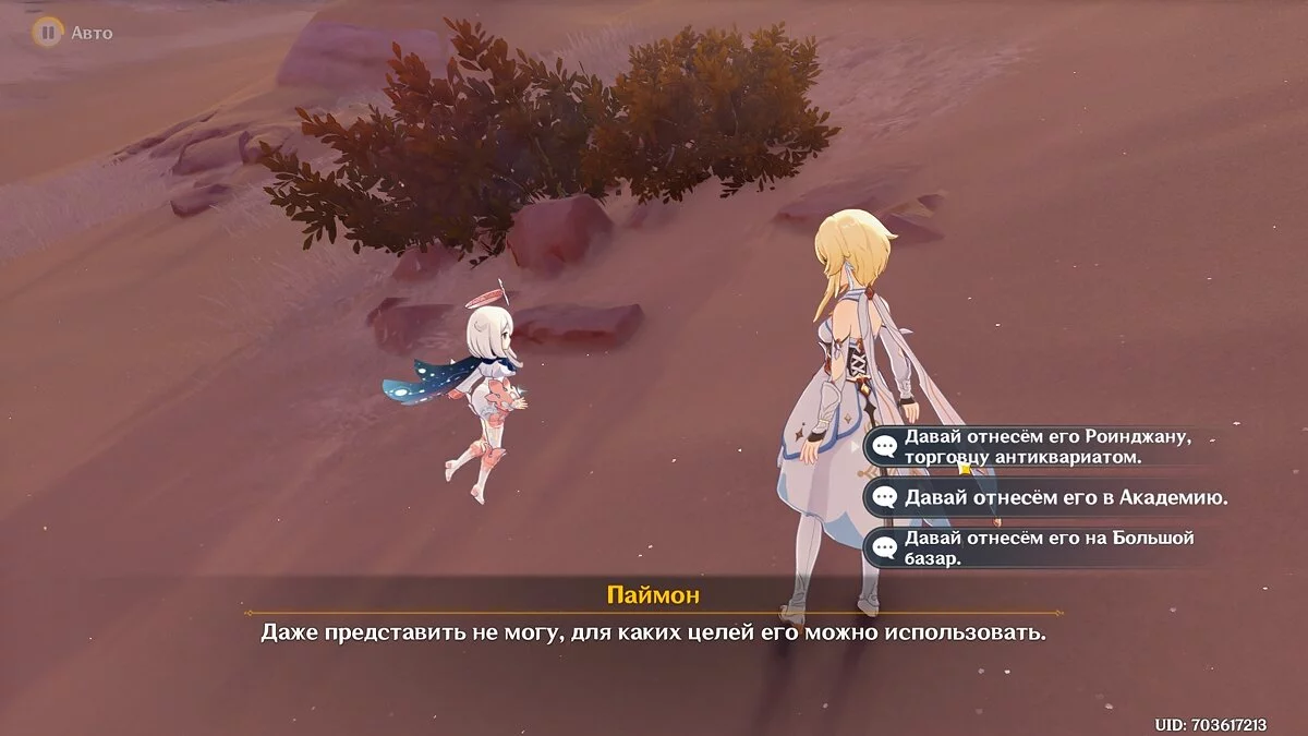 Так вы получите таинственный барабан с Крио меткой. На выбор игра даст три варианта ответа, но независимо от вашего решения придётся отнести барабан Катерине в город Сумеру.