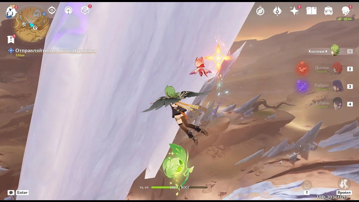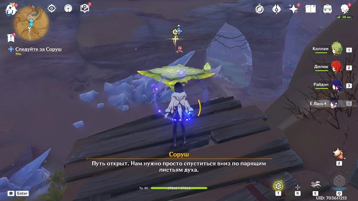 В этот момент появится странное существо — Соруш. Это летающее создание вскоре станет вашим бессменным спутником во время путешествий по новым областям Сумеру и не только. С его помощью придётся решать загадки и головоломки, а также искать разбросанные сундуки. Подробнее об этом существе мы расскажем в отдельном гайде.