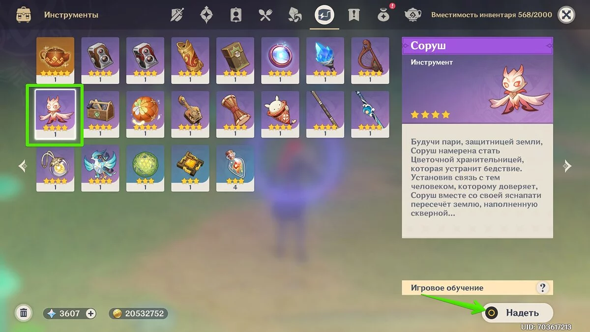 Для начала откройте инвентарь и перейдите в раздел «Инструменты». Выберите здесь Соруш и нажмите «Надеть». С этого момента вы сможете призывать существо и управлять им, переставлять специальные четырёхлистные символы, собирать энергию и совершать другие действия.