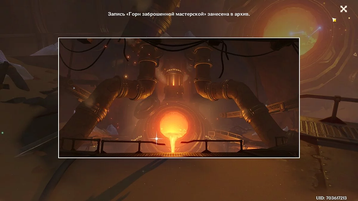 Войдите в дверь справа и сразитесь с группой хиличурлов. Добравшись до огромной печи, смотрите видеоролик на движке. Здесь же можете сделать фото.