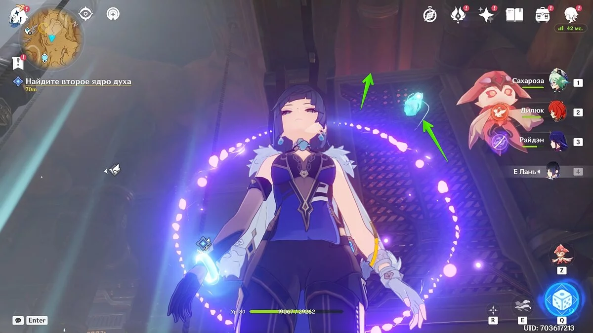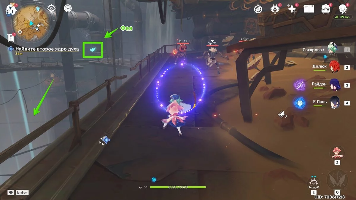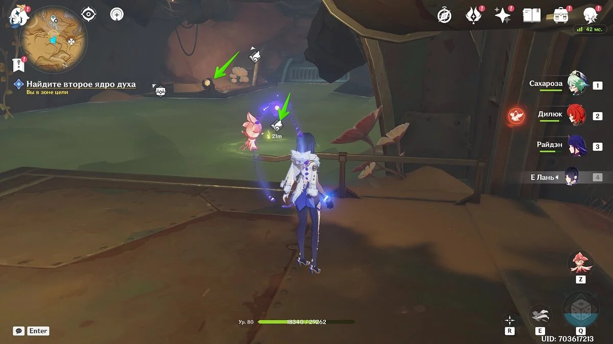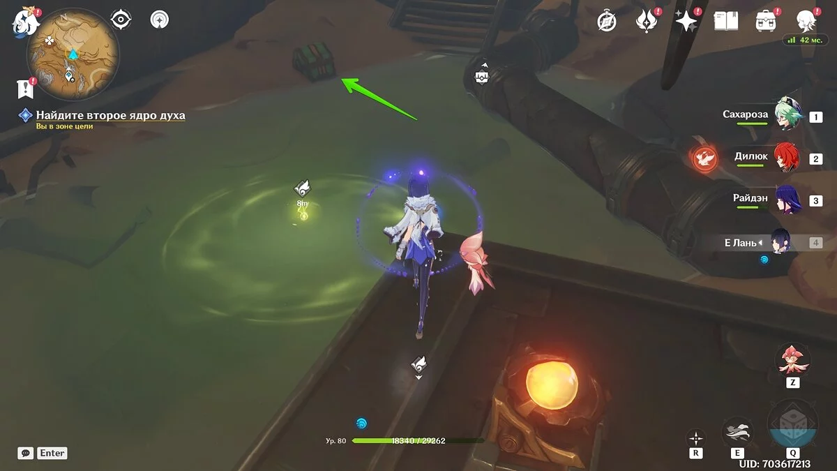 Бегите в открывшуюся дверь и избавьтесь от группы хиличурлов. Чтобы добраться до ядра духа, нужно следовать за феей. Но сперва мы рекомендуем спуститься на нижний уровень подземелья и подобрать дендрокул, а также завершить необязательное испытание (обычный сундук).
