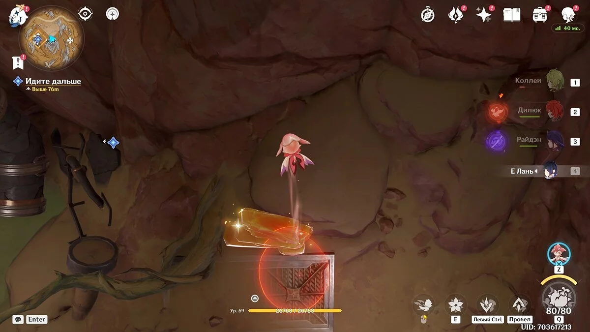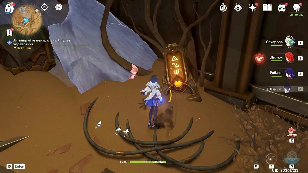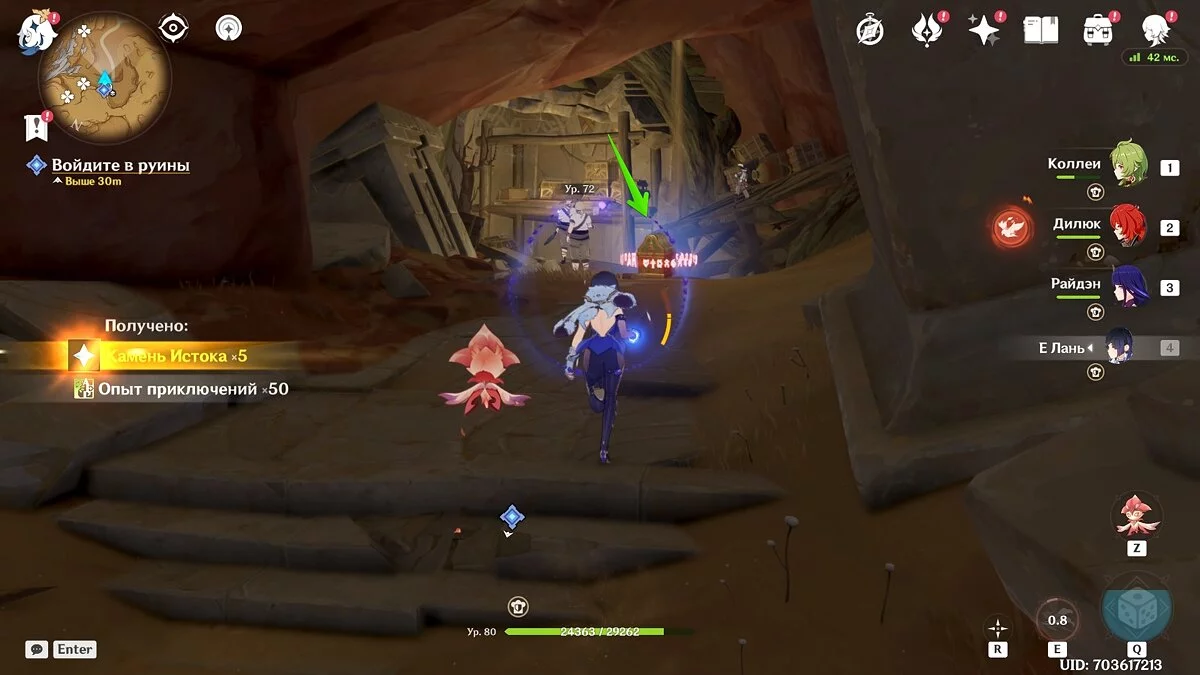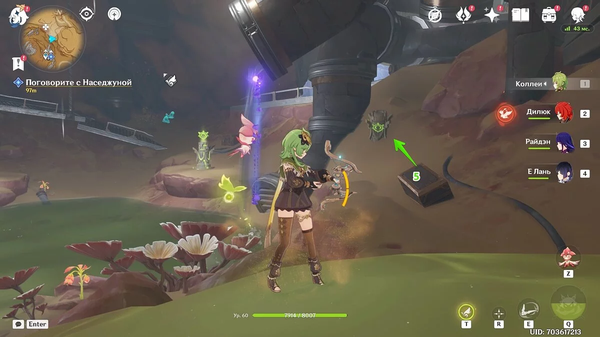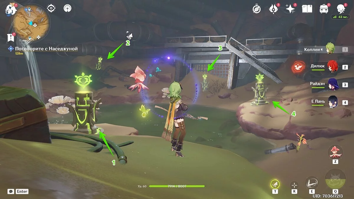 Но также не забудьте осмотреть штольню справа. Здесь есть пять дендро-тотемов, которые нужно активировать в произвольном порядке (обычный сундук).