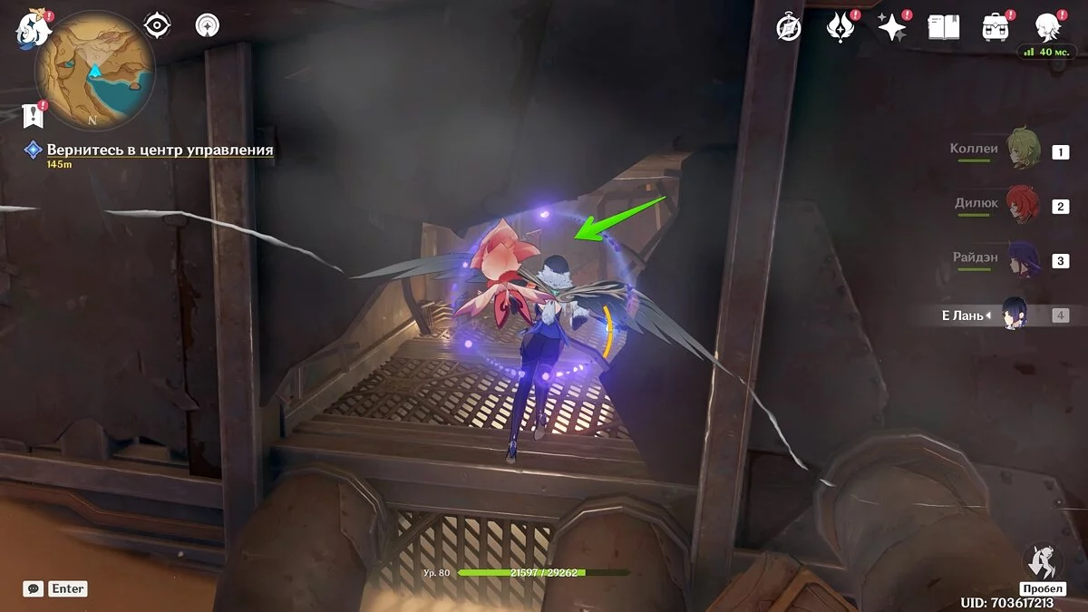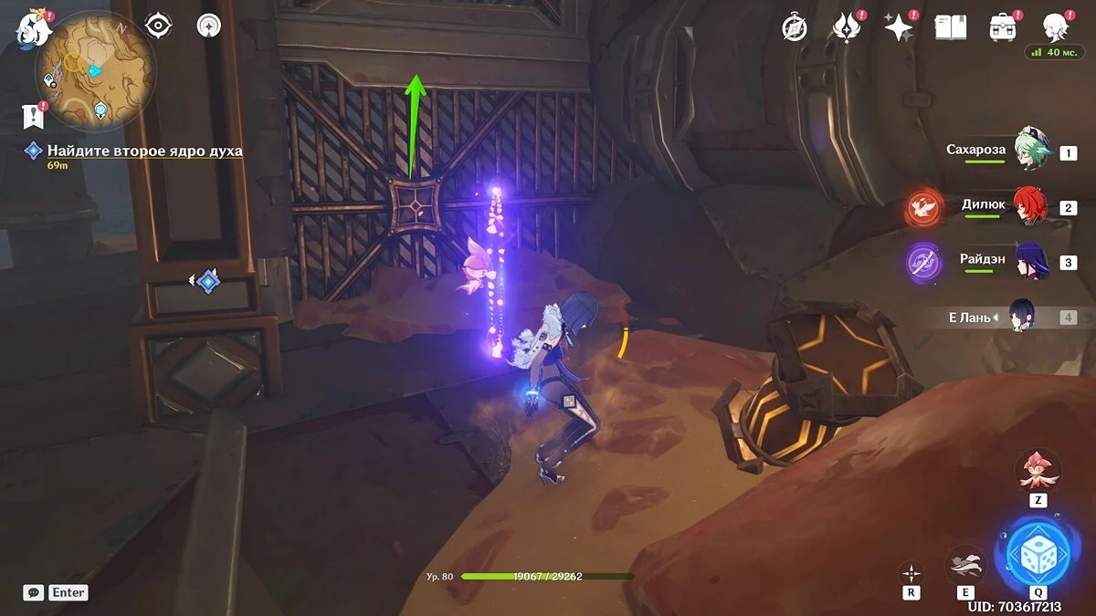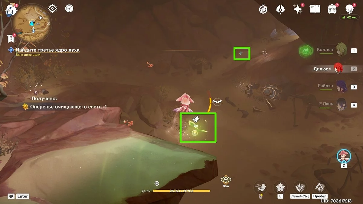 Поднимитесь на платформу выше и следуйте за маркером. На высокой скале вы найдёте ядро духа. Чтобы вернуться обратно, отыщите фую и бегите за ней.