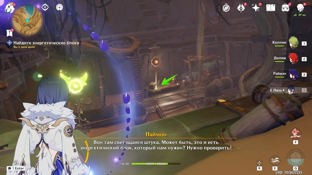В главном зале взаимодействуйте с древним устройством и установите энергетический блок. Задание обновится.