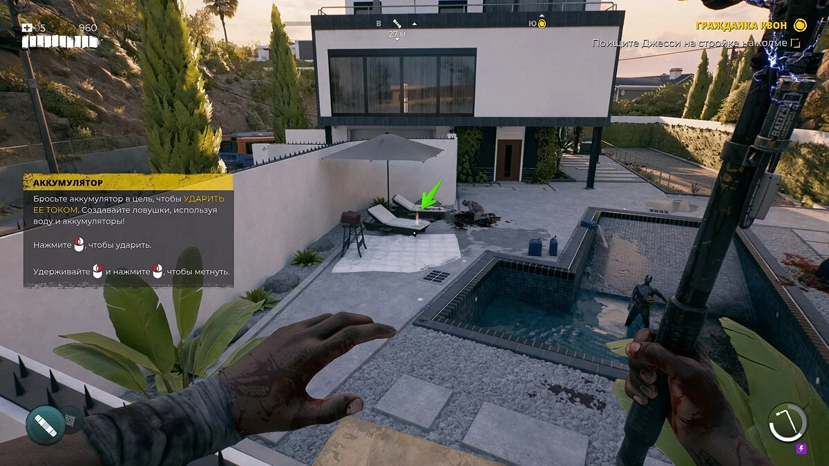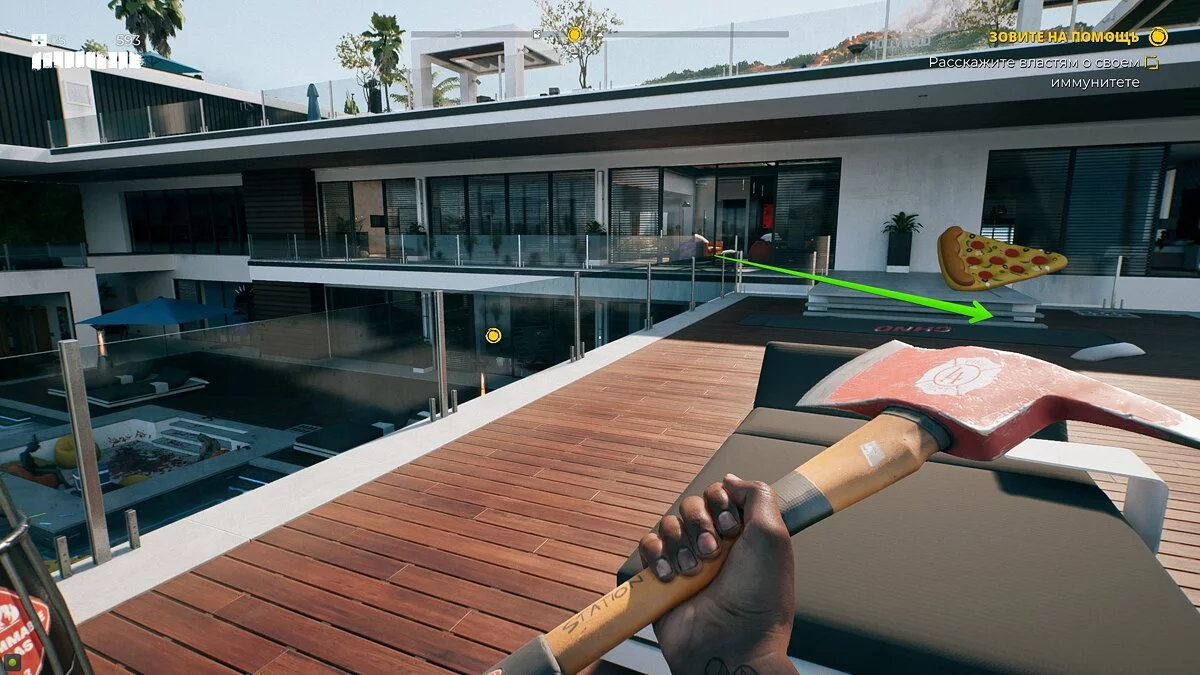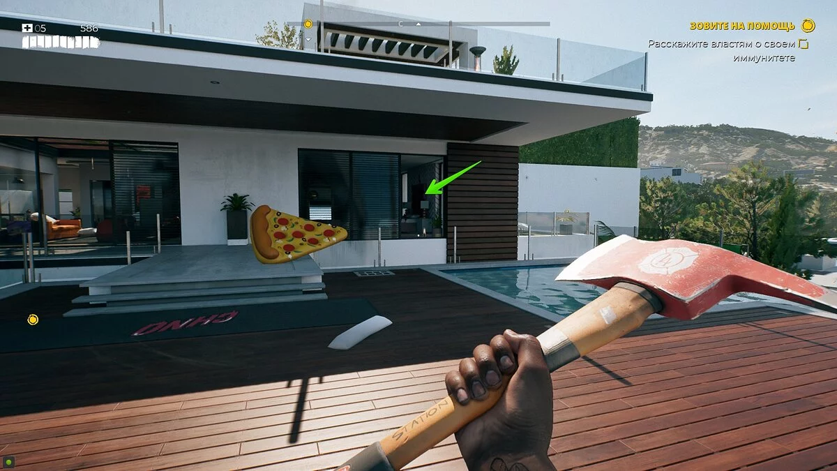 Если вы выполнили условие, вернитесь назад и поднимитесь на балкон над бассейном. Здесь вы увидите окно, которое можно разбить и войти в комнату.