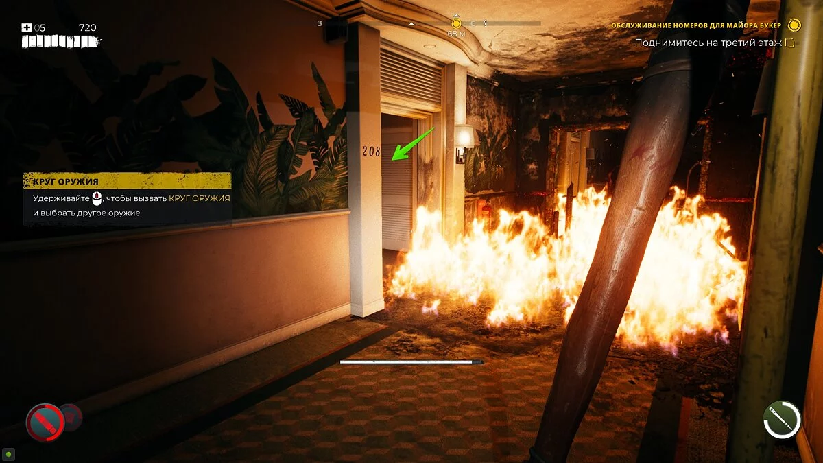 От предыдущего места, где вы вызвали лифт и нашли ключ, следуйте в проход справа и преодолейте завал. Здесь вы найдёте химическую бомбу и сможете потушить пожар у входа в номер 208.