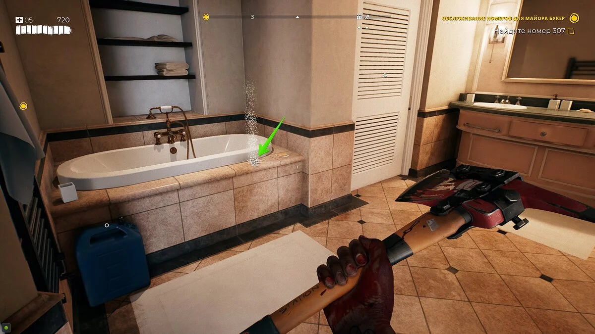 Продолжайте идти за маркером, пока не окажетесь в номере 307. Сразу же сверните налево и откройте дверь в уборную. Перед ванной будет лежать связка ключей.