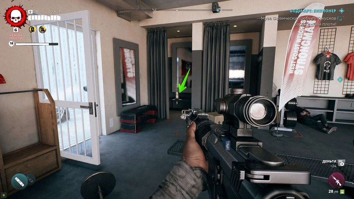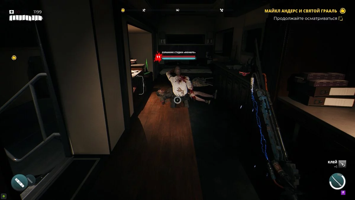 Разбив стекло, сработает сигнализация. Отключите её как можно быстрее. В этом же помещении вы найдёте умение «Утяжелитель», аудиозапись и некоторые припасы.