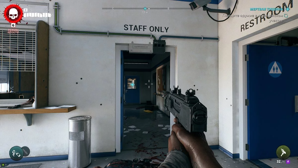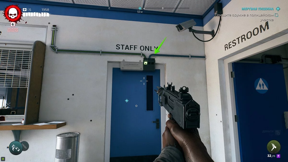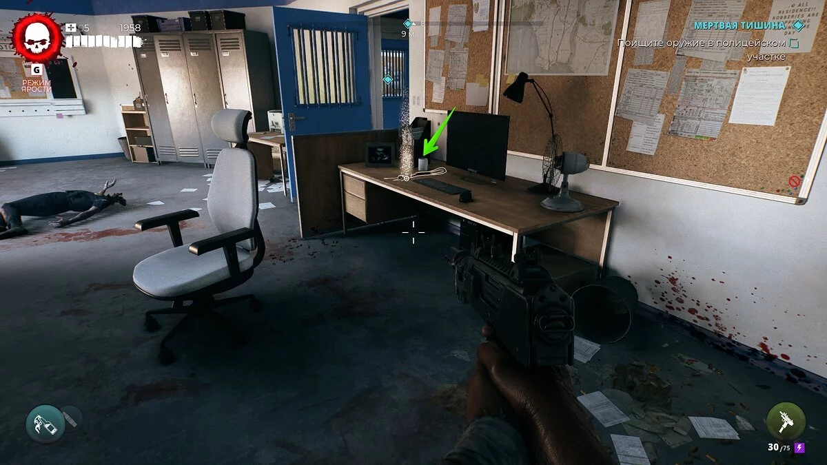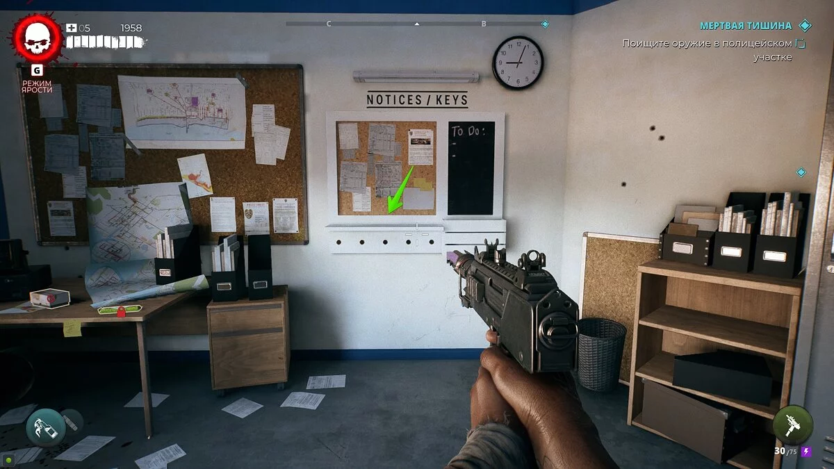 Чтобы проникнуть в полицейский участок, разберитесь с магнитным замком и осмотрите диспетчерскую. На доске справа можно найти ключ-карту от участка.