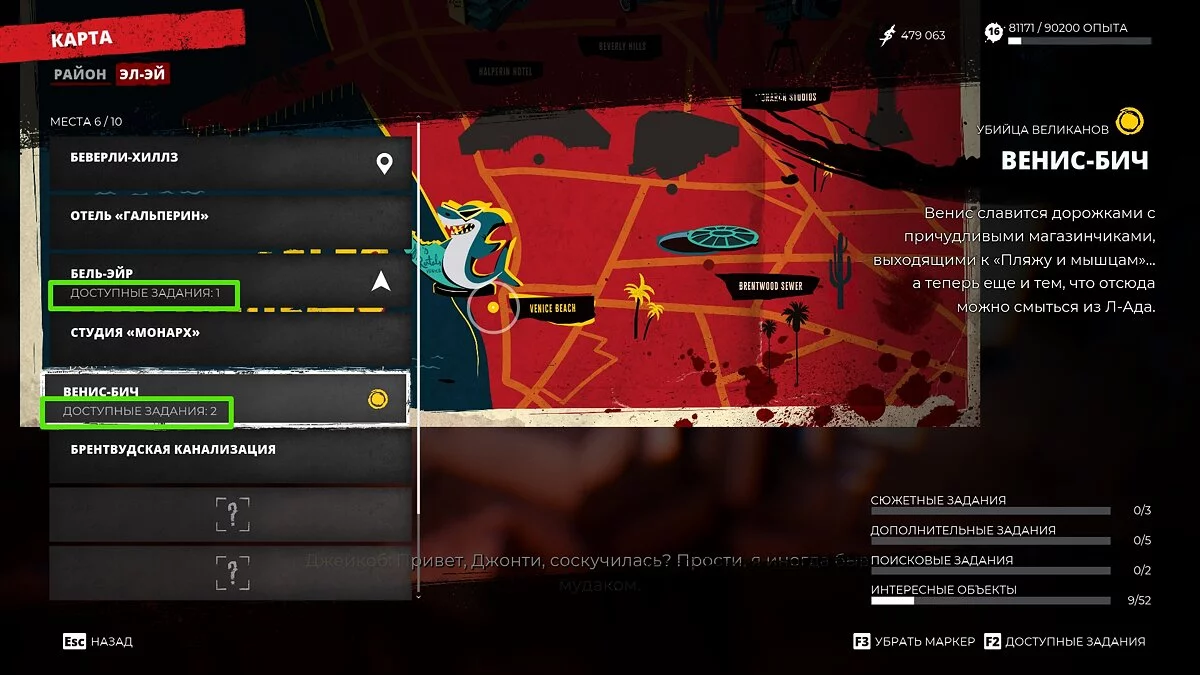 Дополнительные квесты в Dead Island 2 открываются постепенно, поэтому вы легко можете пропустить некоторые из них. Чтобы отыскать доступные задания, достаточно время от времени поглядывать на карту регионов (раздел «Эл-Эй»).