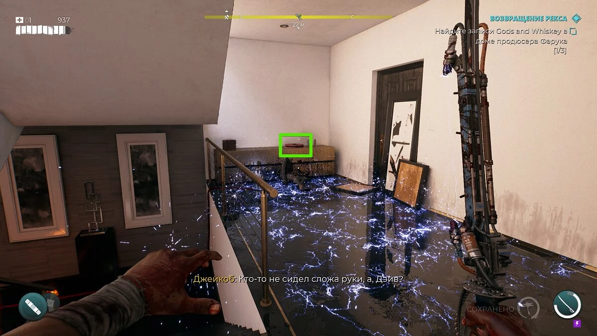 Он попросит починить электричество, чтобы включить подъёмник. Спуститесь по лестнице и откройте дверь. Запитать дом можно при помощи канистры с водой. Достаточно вылить воду на пол. Канистра находится во внутреннем дворе, рядом с металлической аркой.