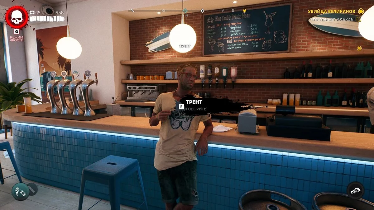 Отправляйтесь в бар и пообщайтесь с Трентом. Парень попросит осмотреть полицейский участок поблизости и раздобыть оружие.
