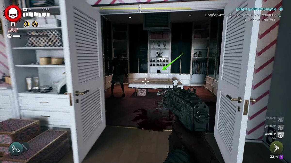 Оказавшись внутри, пройдите к компьютерному столу. Справа от него откроется дверь, откуда выпрыгнут два мертвяка. Убейте их и заберите сигары.