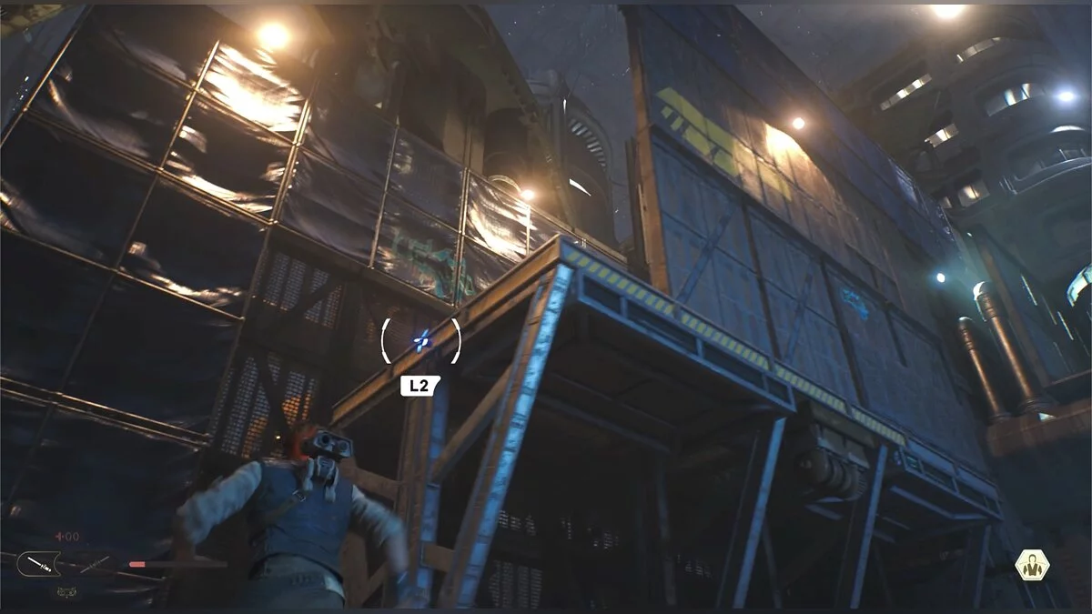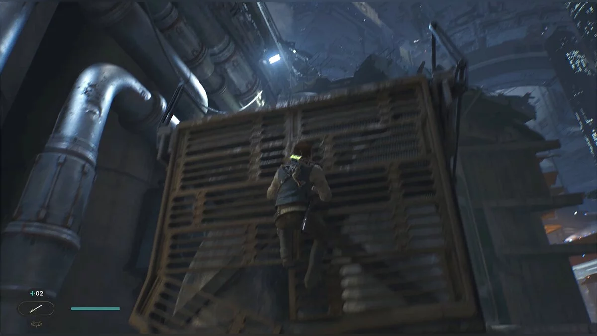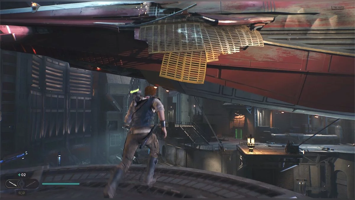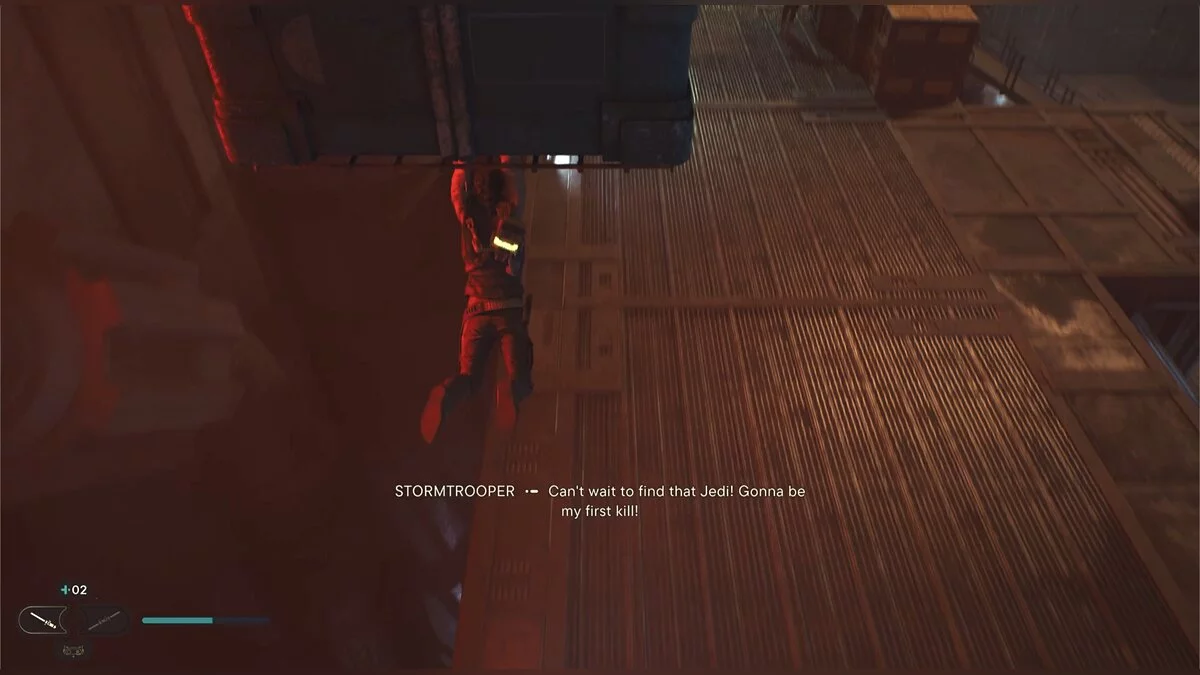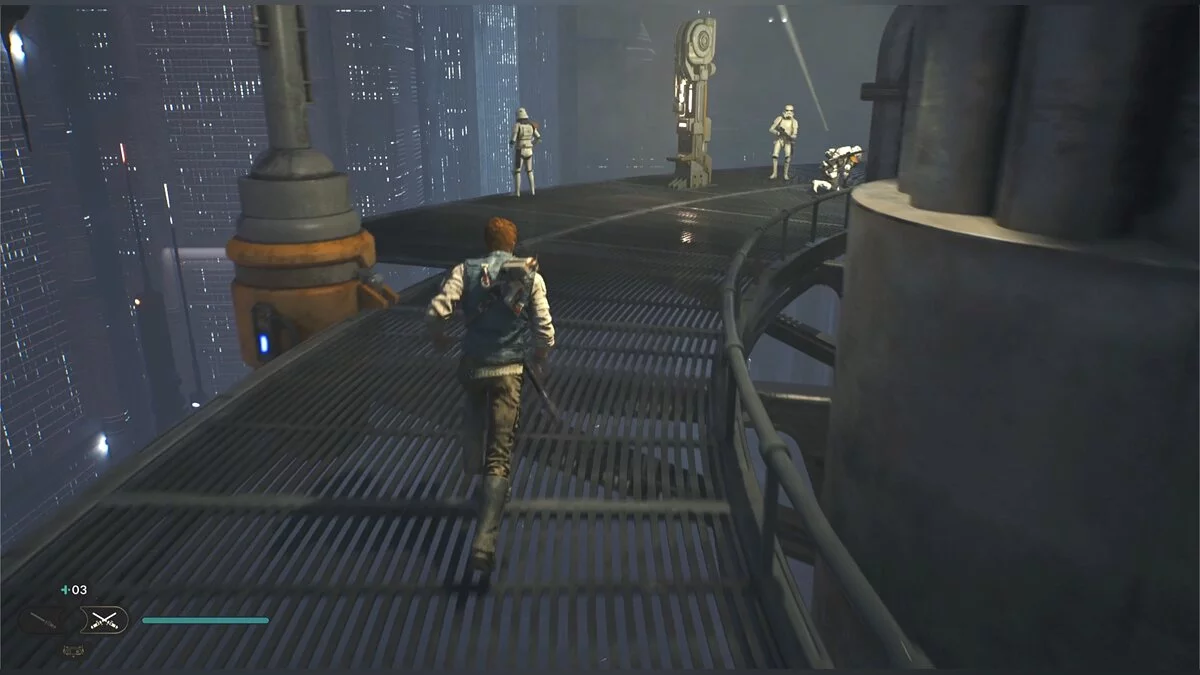 После боя начнется кат-сцена. Карабкайтесь влево, а затем по железным конструкциям вверх и снова налево. Путь всего один, вы не потеряетесь. Продолжайте движение, пока штурмовики не выстрелят в балку и герой не упадет. Вы окажетесь на крышах нижних уровней доков, но главная цель Кэла — корабль сенатора, поэтому придется подниматься обратно.