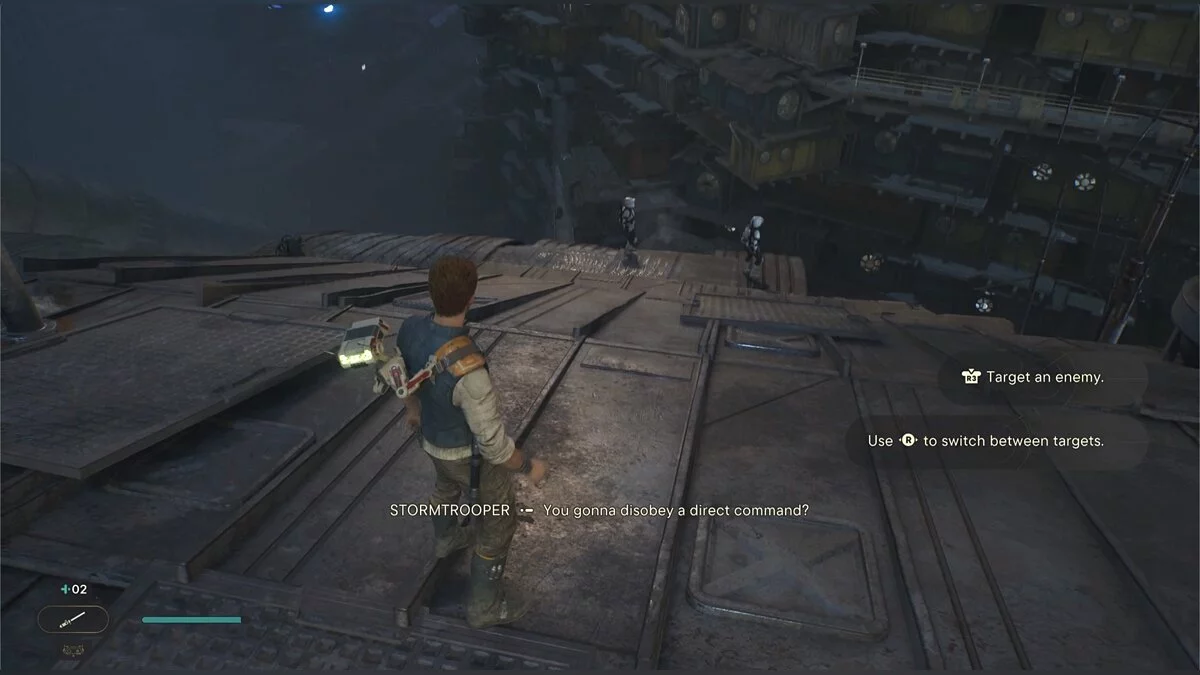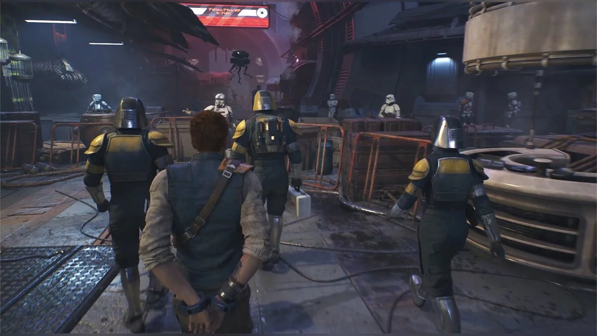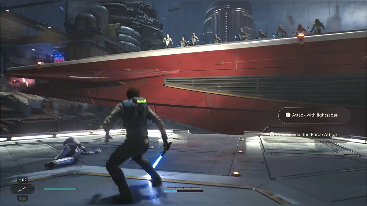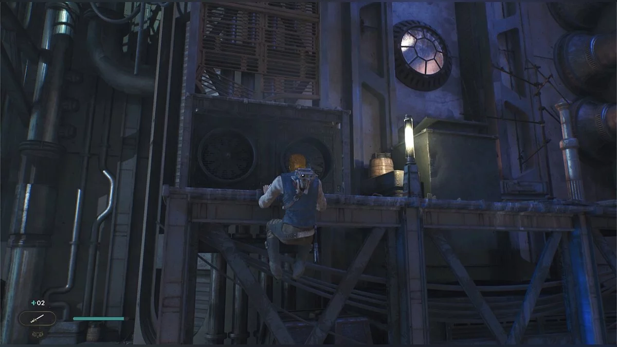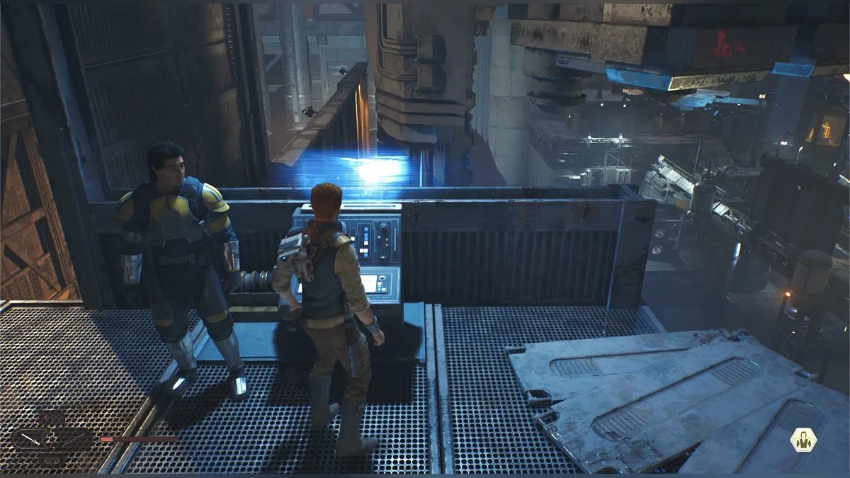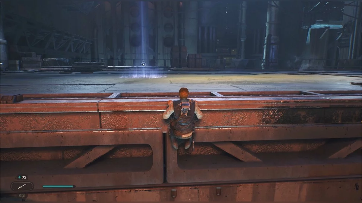 После боя начнется кат-сцена. Карабкайтесь влево, а затем по железным конструкциям вверх и снова налево. Путь всего один, вы не потеряетесь. Продолжайте движение, пока штурмовики не выстрелят в балку и герой не упадет. Вы окажетесь на крышах нижних уровней доков, но главная цель Кэла — корабль сенатора, поэтому придется подниматься обратно.