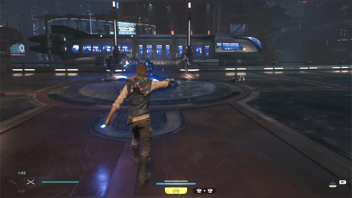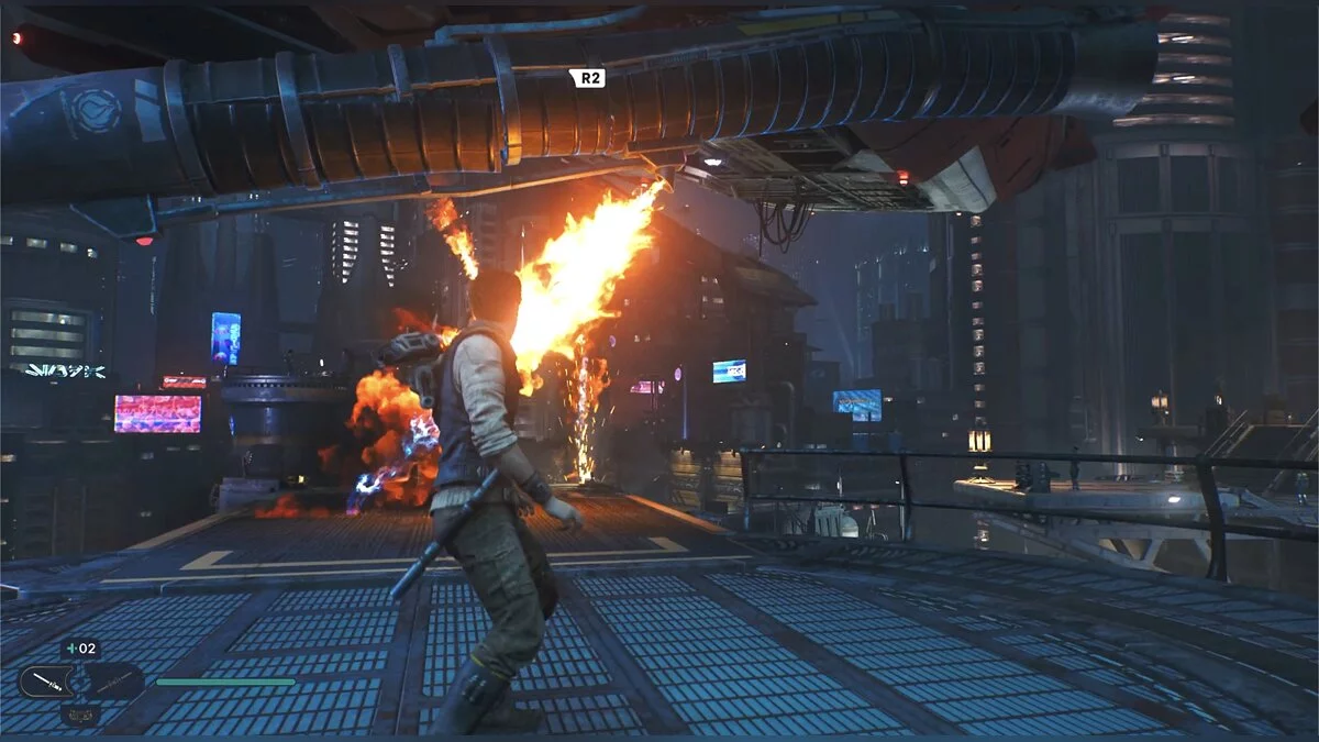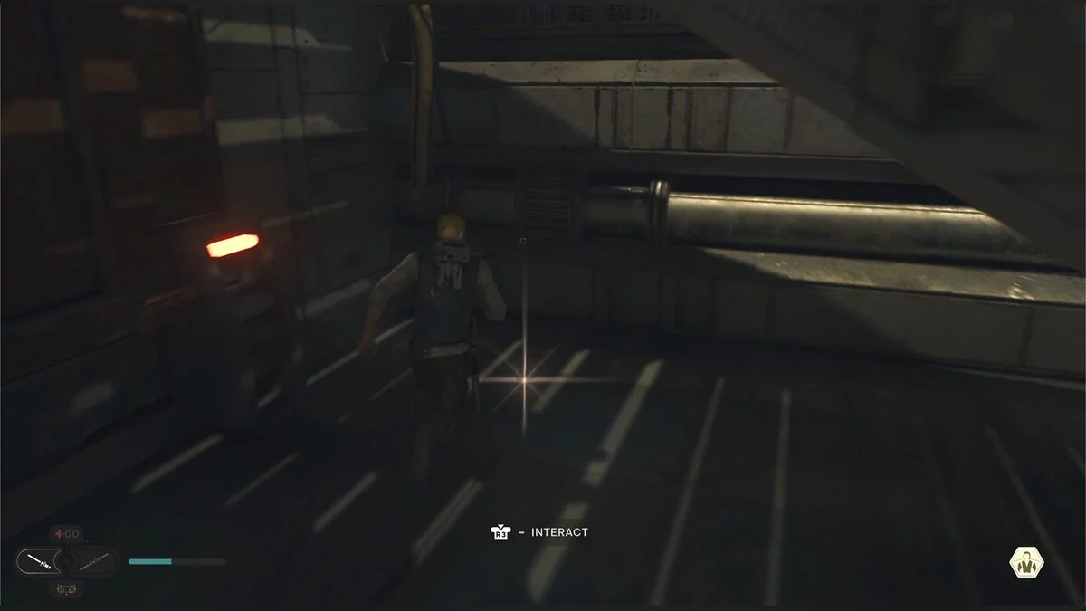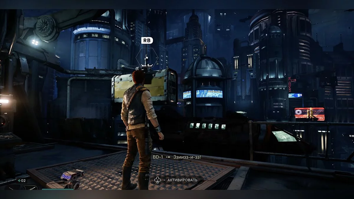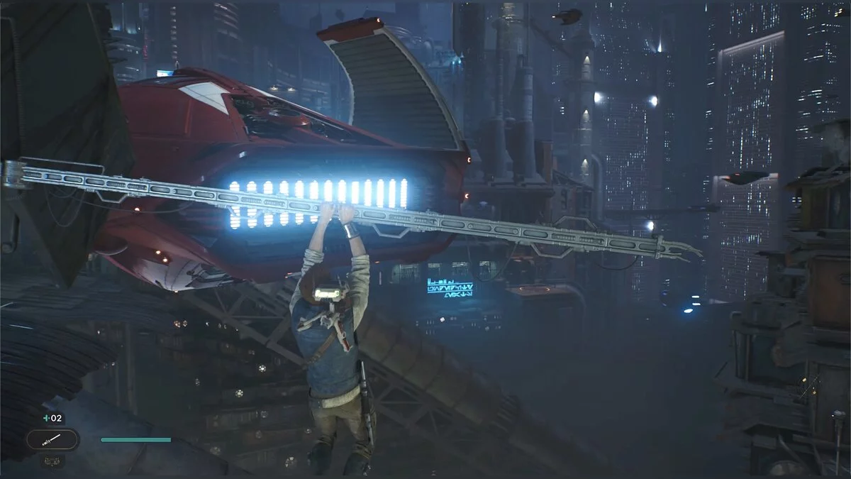После боя начнется кат-сцена. Карабкайтесь влево, а затем по железным конструкциям вверх и снова налево. Путь всего один, вы не потеряетесь. Продолжайте движение, пока штурмовики не выстрелят в балку и герой не упадет. Вы окажетесь на крышах нижних уровней доков, но главная цель Кэла — корабль сенатора, поэтому придется подниматься обратно.