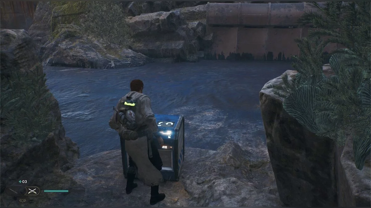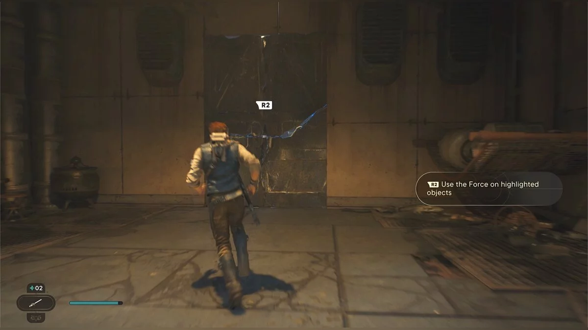 Вернитесь к закрытой двери и разблокируйте ее с помощью дроида. Примените Силу на трубу с водой и перепрыгните к ящику — запчасть для меча.