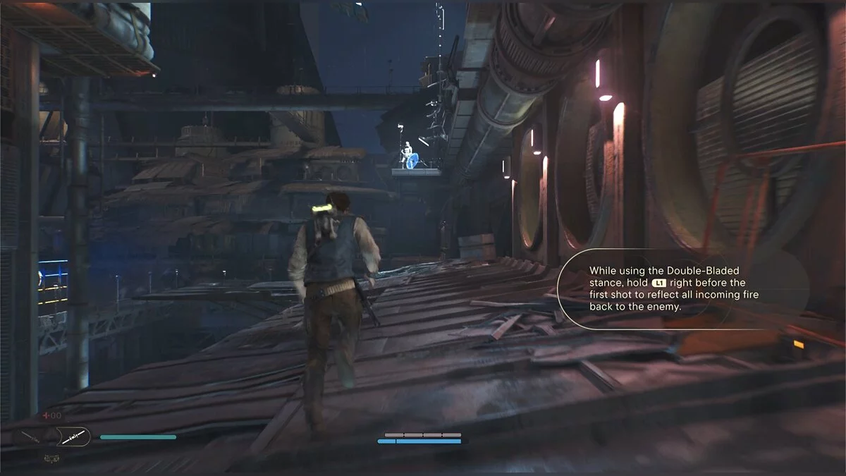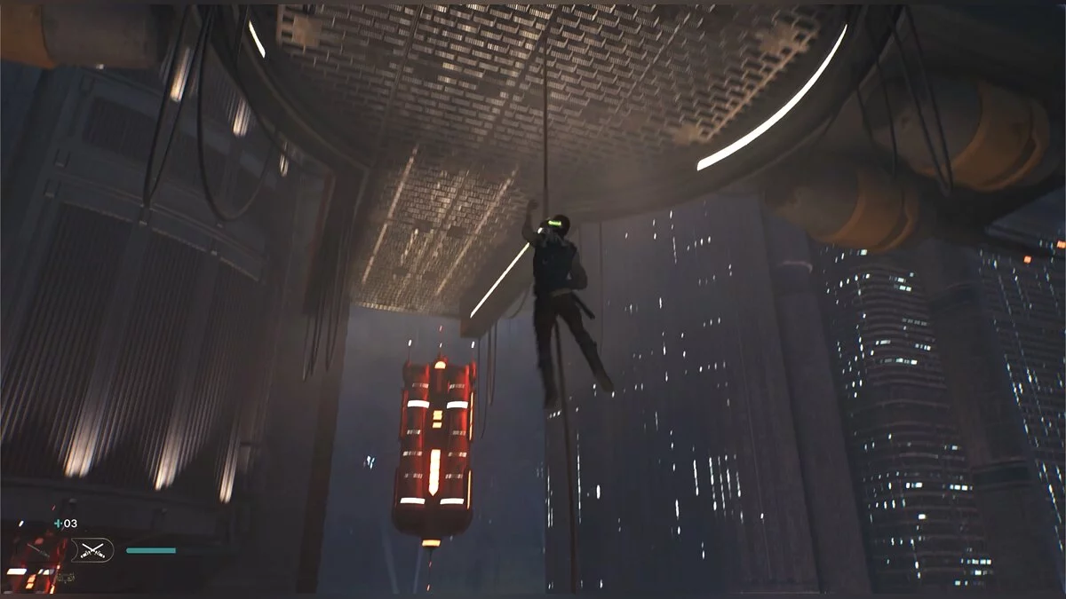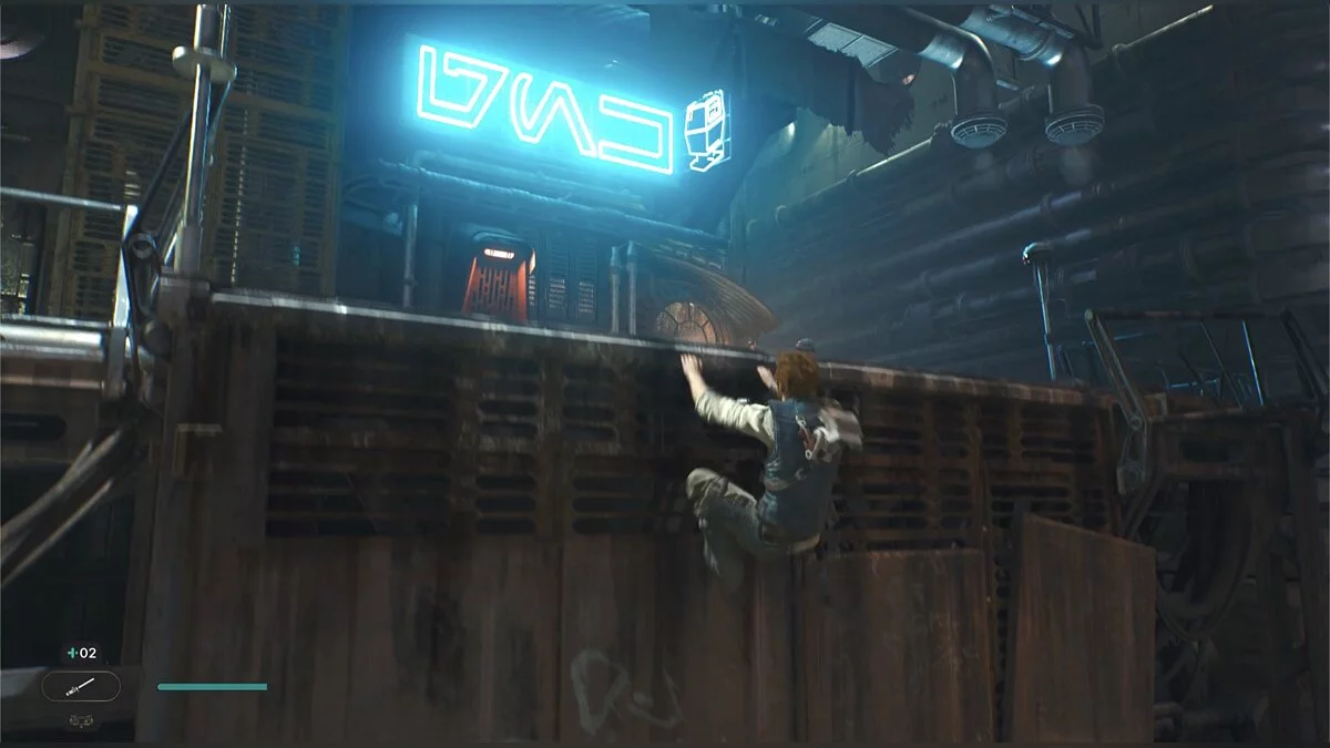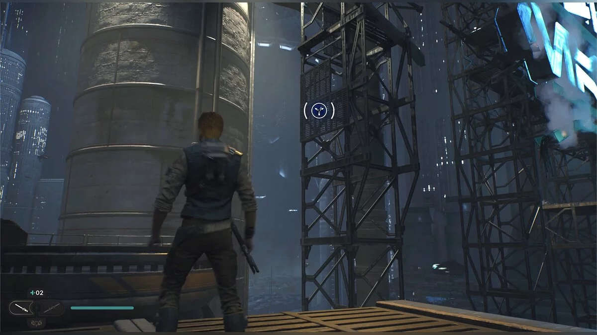 Пройдите по трубе и подпрыгните, чтобы Кэл уцепился за железную конструкцию. Продвигайтесь до конца, пока не появится кнопка, что можно напасть на штурмовиков внизу. Отбейте все выстрелы мечом и прыгайте туда, где стояли солдаты. Слева под неоновой вывеской еще одна узкая щель.