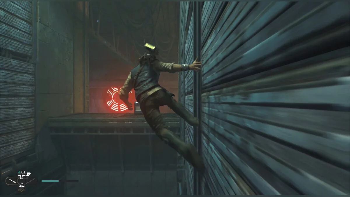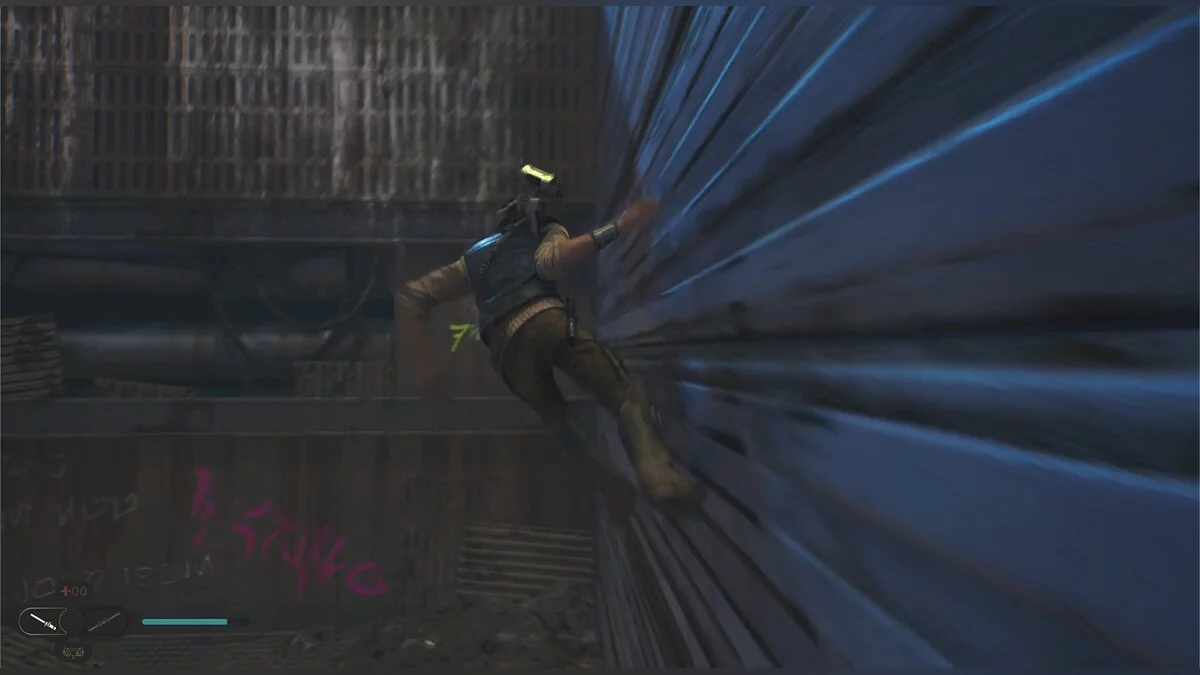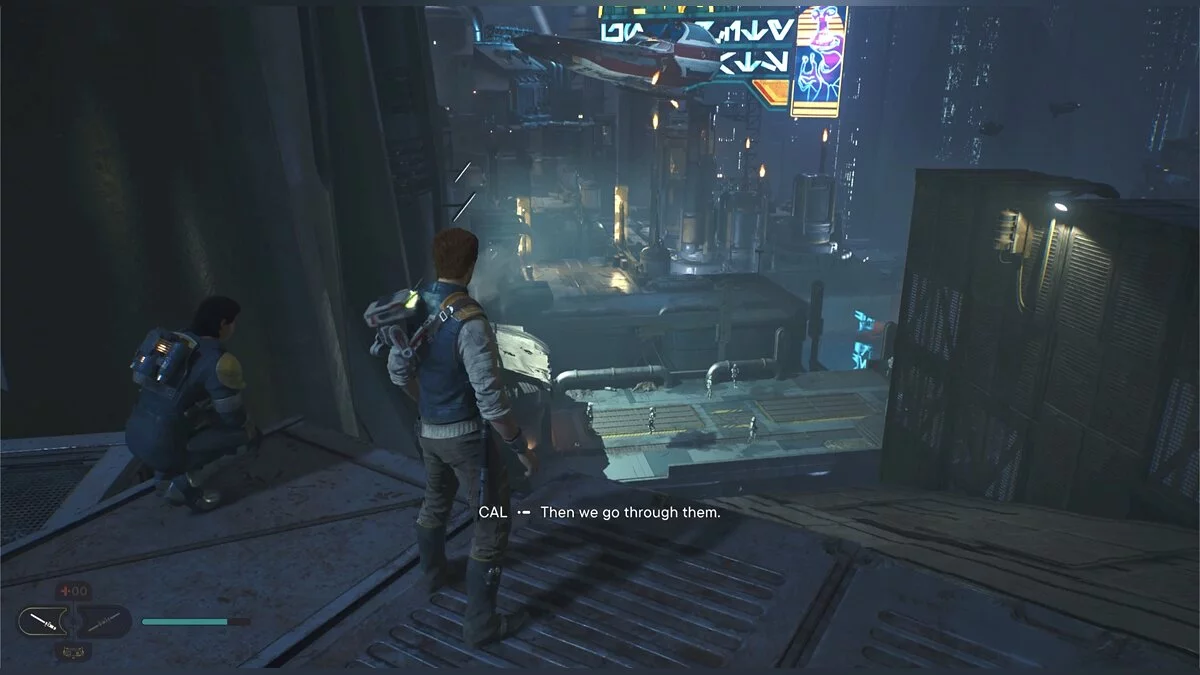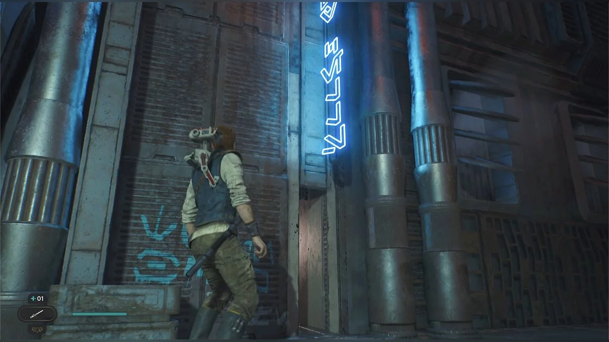 Пройдите по трубе и подпрыгните, чтобы Кэл уцепился за железную конструкцию. Продвигайтесь до конца, пока не появится кнопка, что можно напасть на штурмовиков внизу. Отбейте все выстрелы мечом и прыгайте туда, где стояли солдаты. Слева под неоновой вывеской еще одна узкая щель.