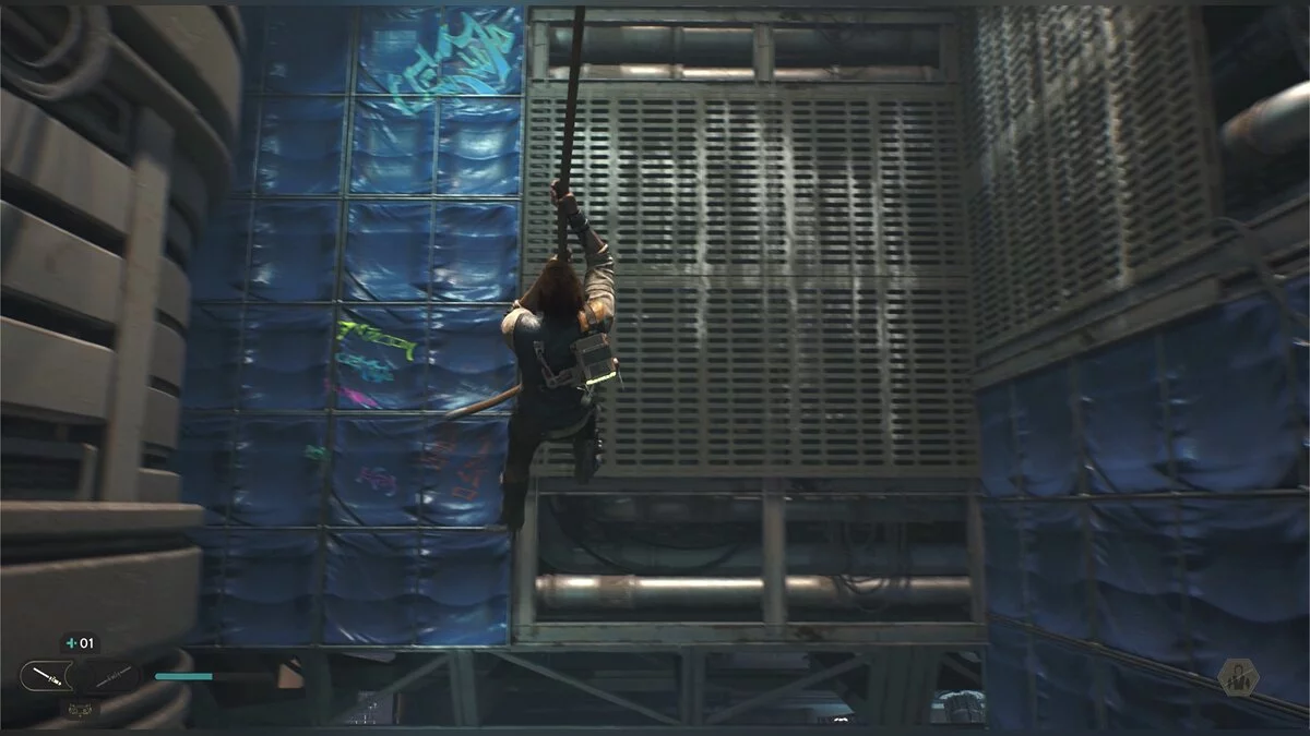 Теперь вам нужно вернуться. Места, доступные для крюка, отмечены специальной кнопкой и светятся синим. Найдите такое, чтобы выбраться с арены. Используйте терминал, чтобы повернуть конструкцию и перепрыгнуть на платформу. С нее нужно еще раз использовать кошку и перепрыгнуть на стену, по которой можно спуститься.