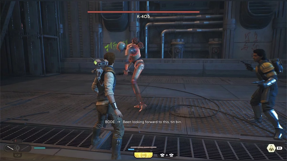 Так как это первый босс — проблем не должно возникнуть, однако стоит напомнить, что когда враг светится красным — парировать его атаку нельзя. Дроид очень часто применяет подобные атаки. Не забывайте пользоваться помощью Боуда — он отвлечет внимание босса на себя и даст возможность нанести несколько сильных атак. Чтобы ускорить сражение, активируйте замедление времени. Это поможет быстро ликвидировать противника. После победы осмотрите угол арены, чтобы подобрать крюк-кошку.