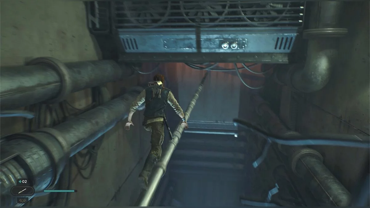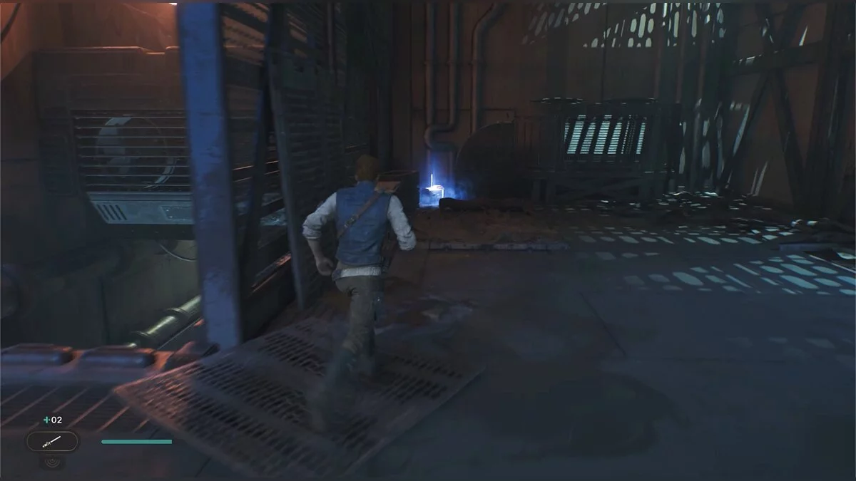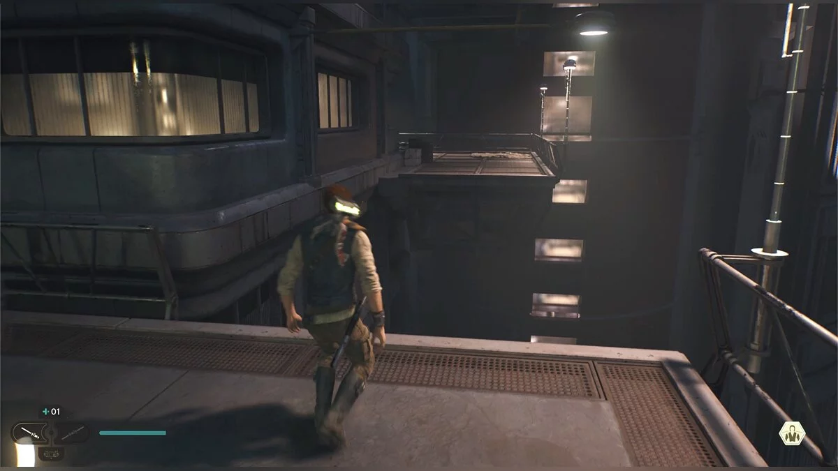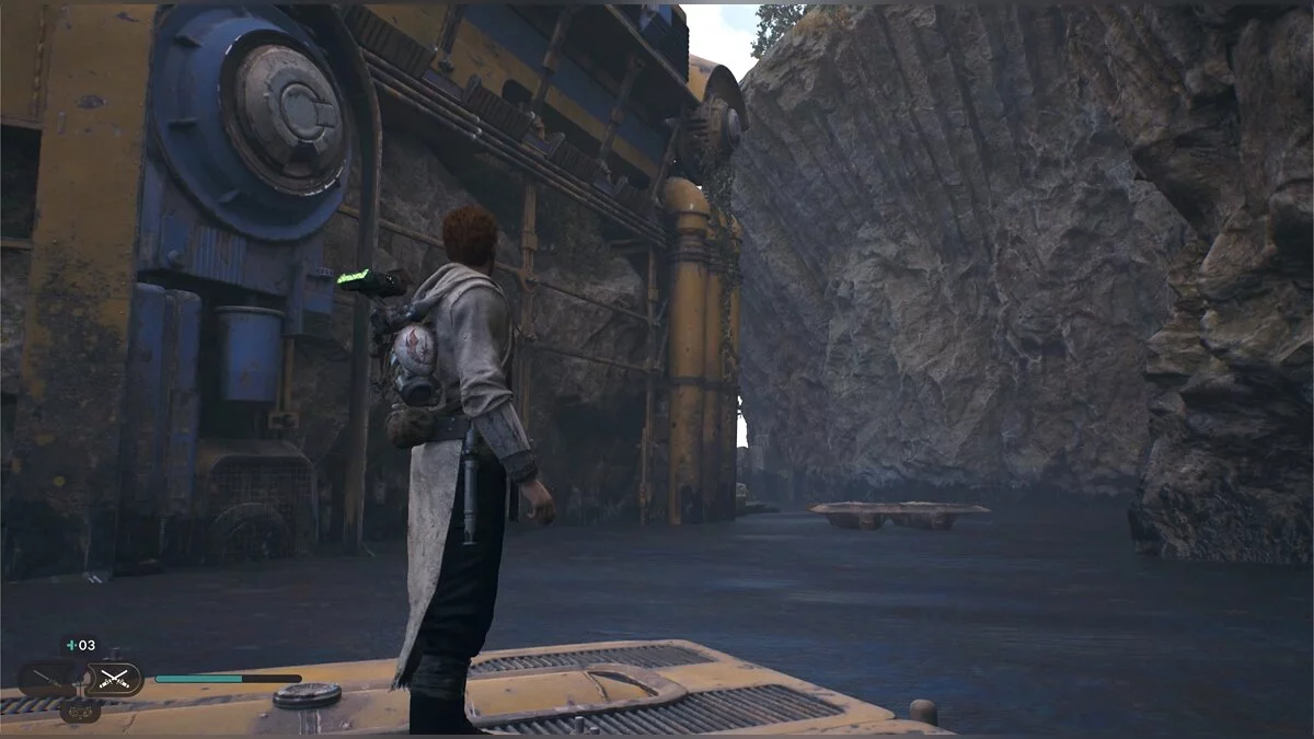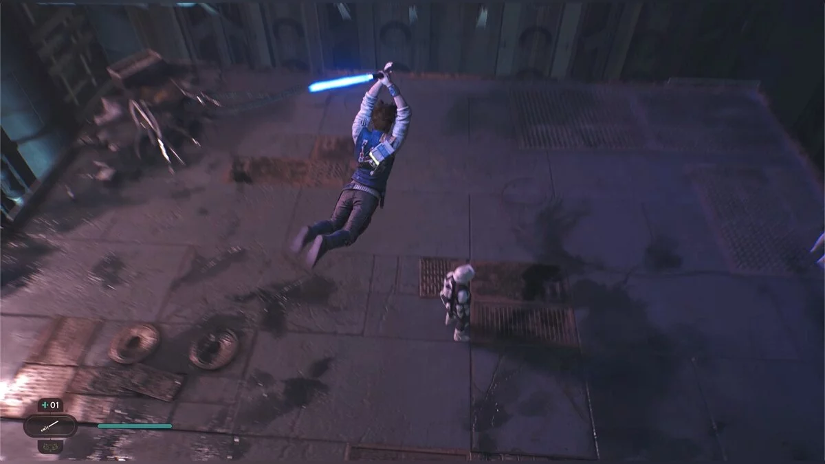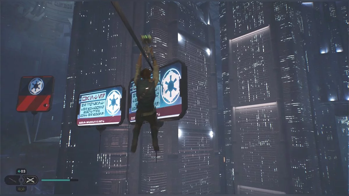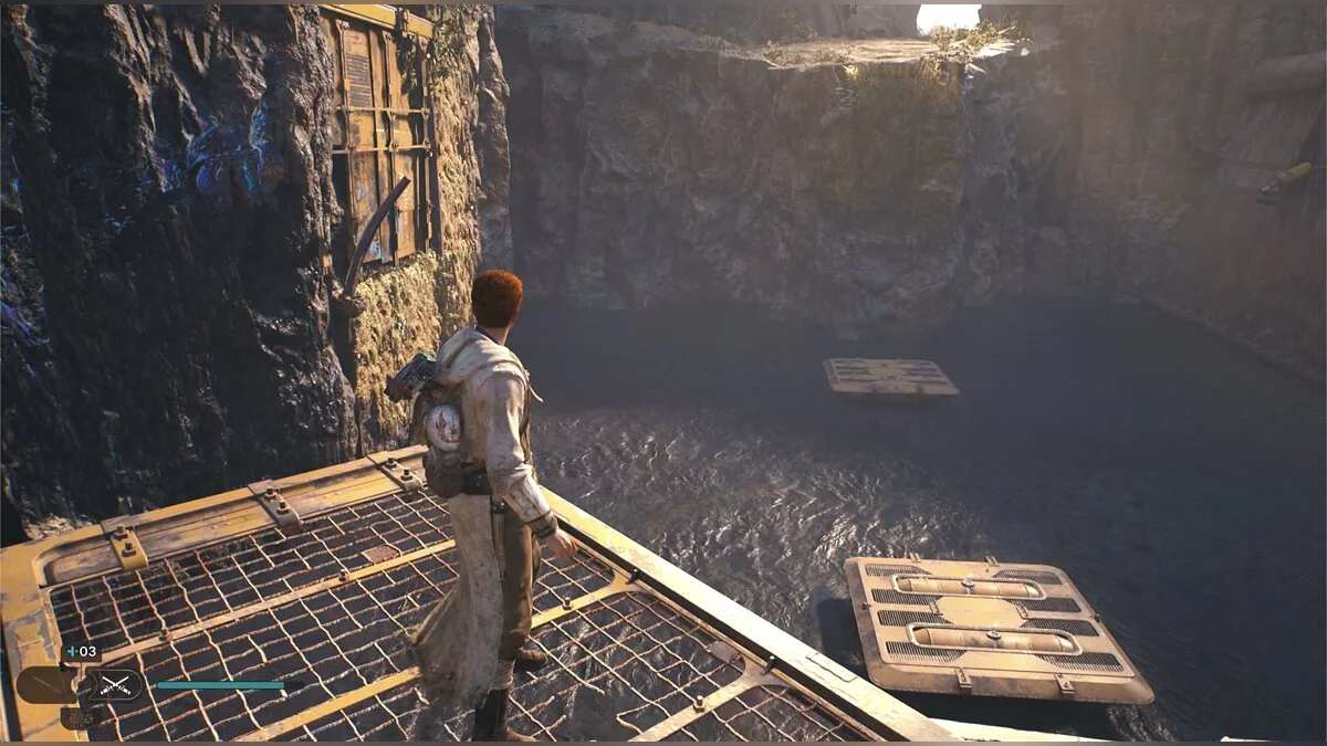Кэл упадет на нижний уровень. Скатитесь по горке и сразу же попадете на мост с отходами. Сзади вас лазеры, которые постепенно приближаются. Беги в противоположную сторону и используйте в нужные моменты крюк-кошку. В следующей зоне победите летающего имперского дроида, а затем прыжками от стены поднимайтесь наверх. Тут круг для медитации, а также два пути. Один наверх, другой направо. Сначала запрыгните наверх. Победите дроида и откройте сундук — дополнительная аптечка.