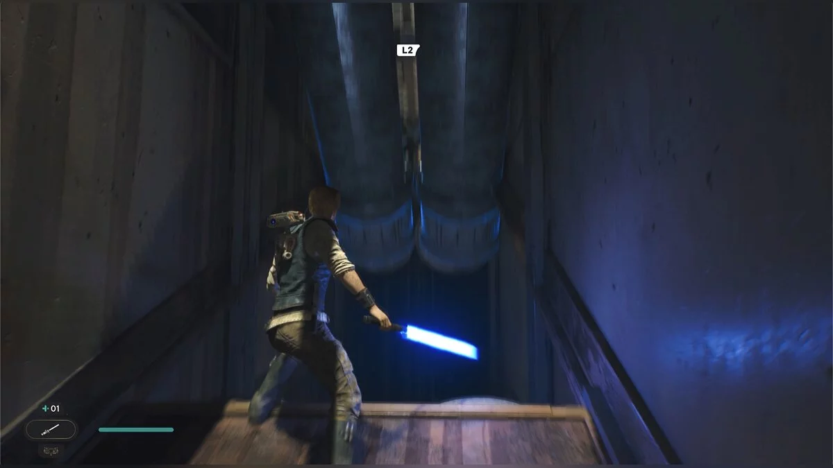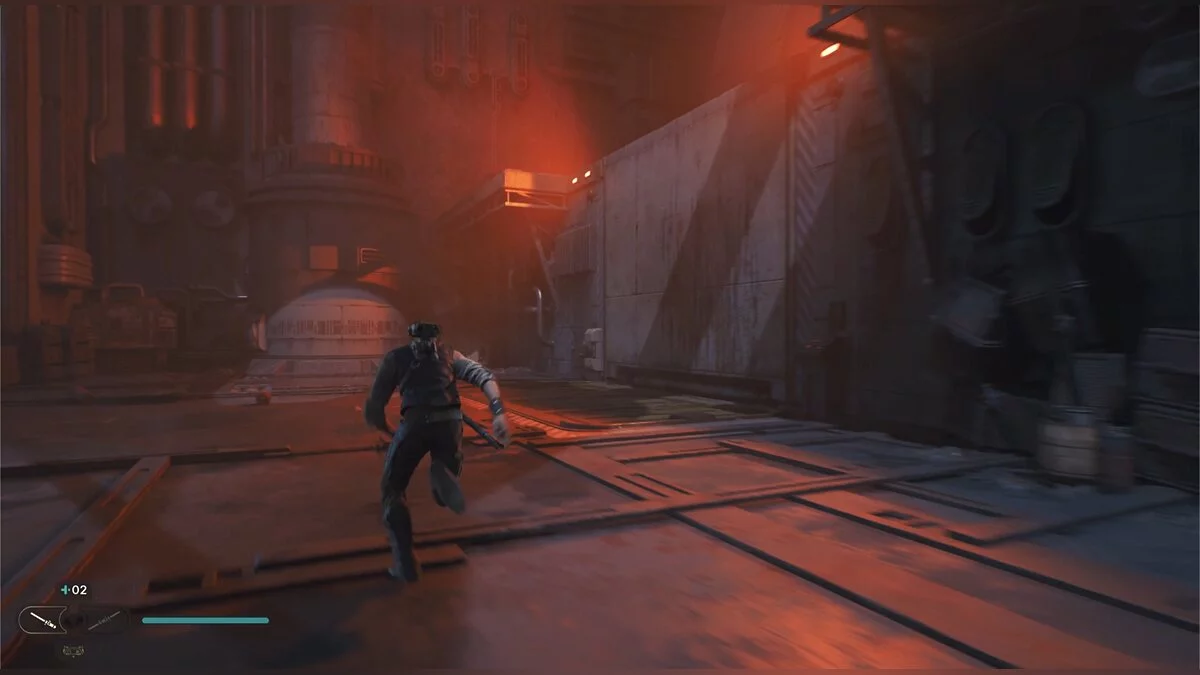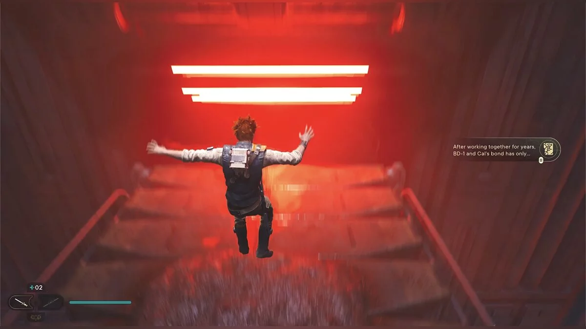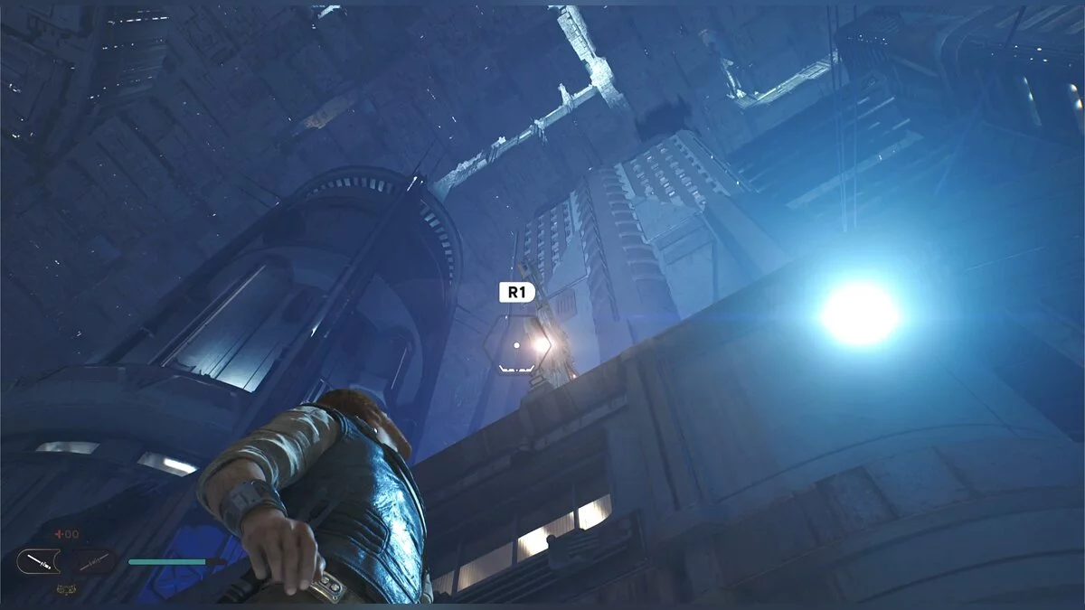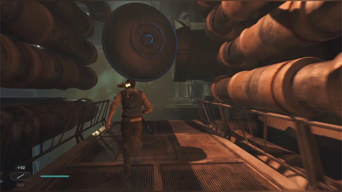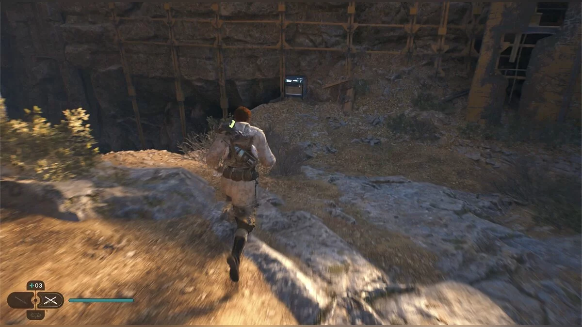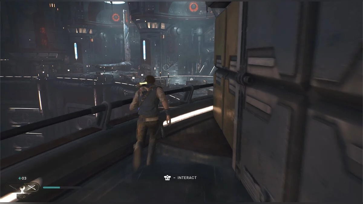 Кэл упадет на нижний уровень. Скатитесь по горке и сразу же попадете на мост с отходами. Сзади вас лазеры, которые постепенно приближаются. Беги в противоположную сторону и используйте в нужные моменты крюк-кошку. В следующей зоне победите летающего имперского дроида, а затем прыжками от стены поднимайтесь наверх. Тут круг для медитации, а также два пути. Один наверх, другой направо. Сначала запрыгните наверх. Победите дроида и откройте сундук — дополнительная аптечка.