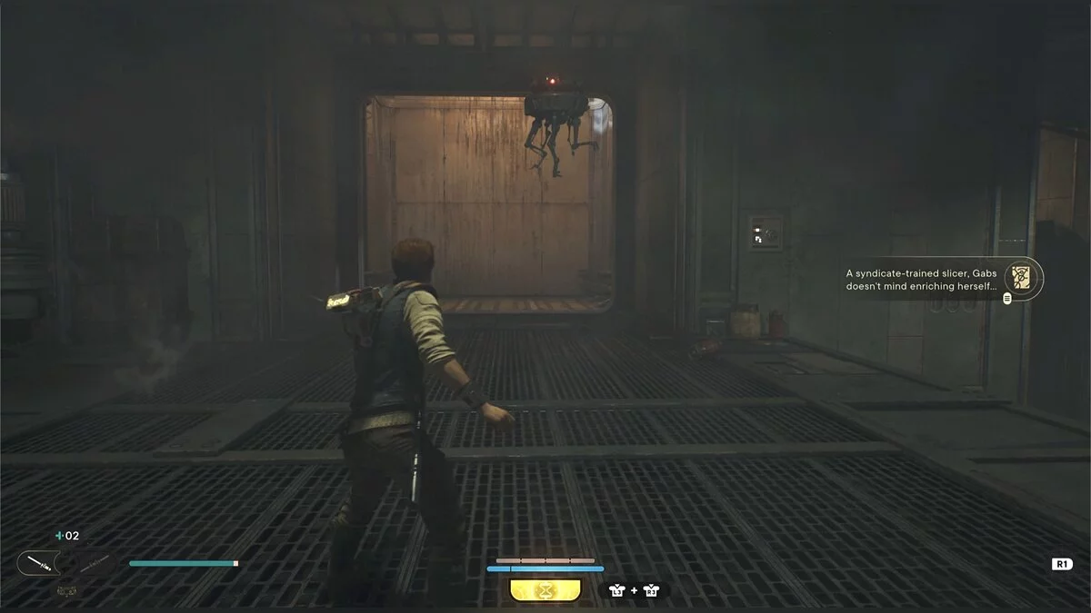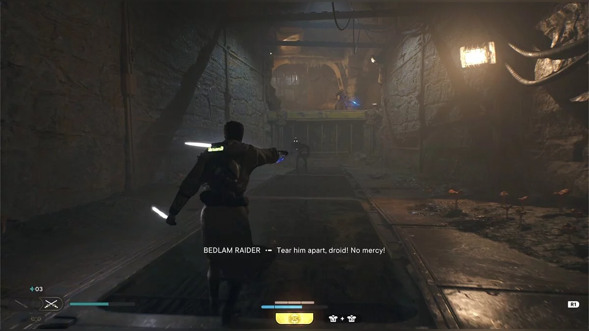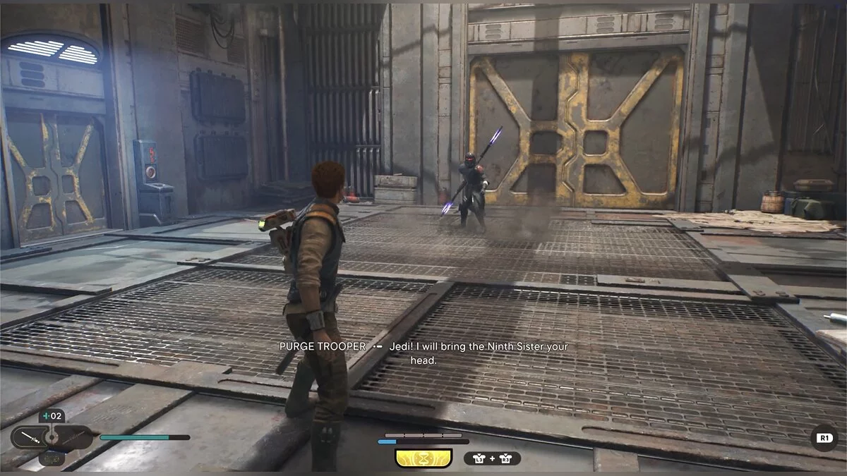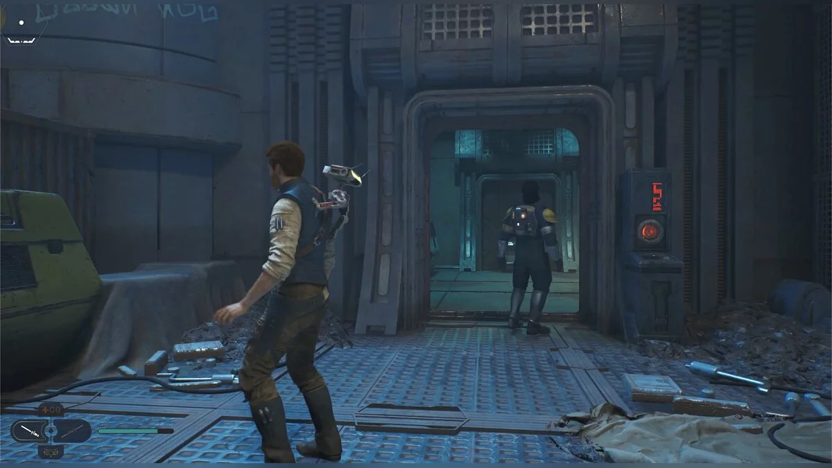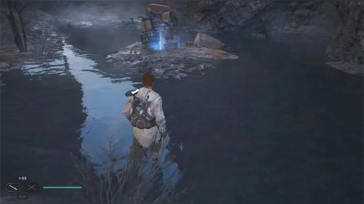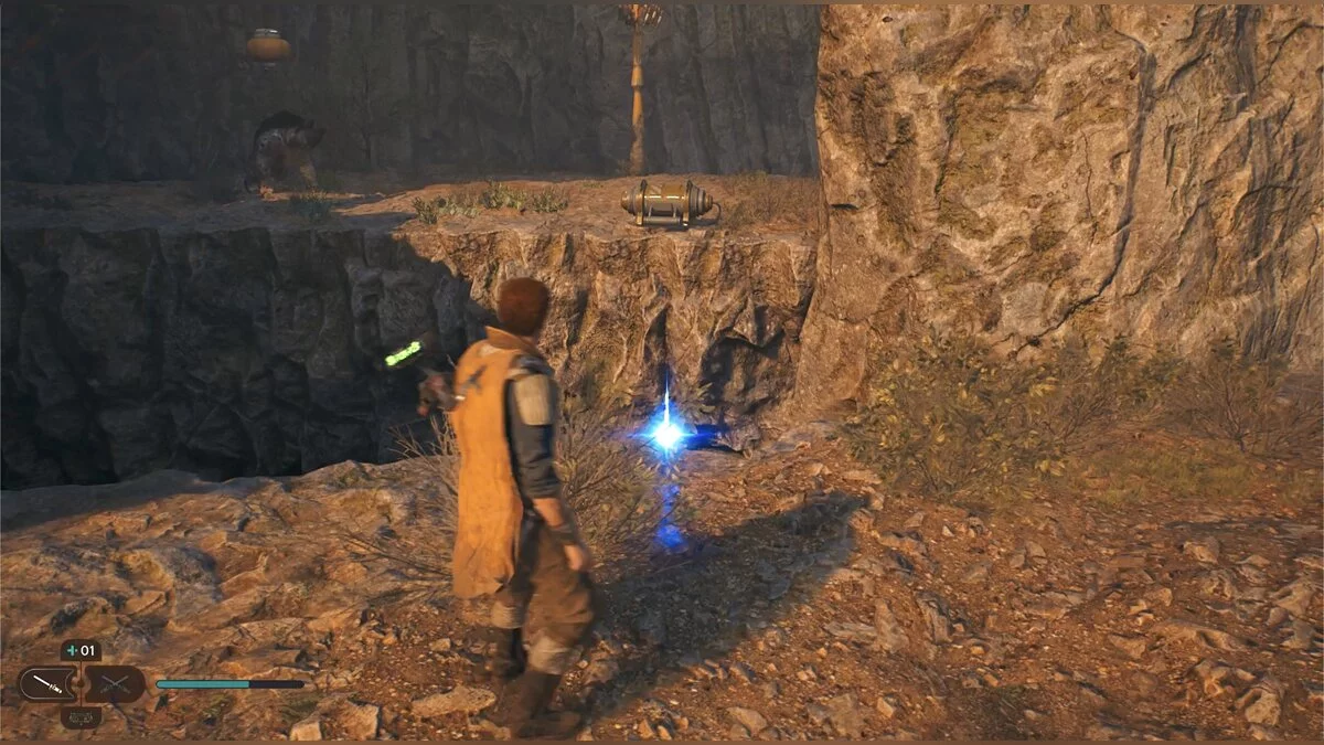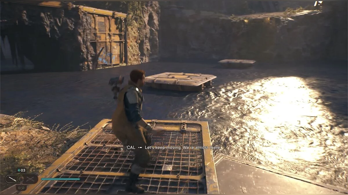 Кэл упадет на нижний уровень. Скатитесь по горке и сразу же попадете на мост с отходами. Сзади вас лазеры, которые постепенно приближаются. Беги в противоположную сторону и используйте в нужные моменты крюк-кошку. В следующей зоне победите летающего имперского дроида, а затем прыжками от стены поднимайтесь наверх. Тут круг для медитации, а также два пути. Один наверх, другой направо. Сначала запрыгните наверх. Победите дроида и откройте сундук — дополнительная аптечка.